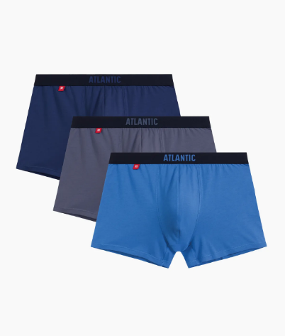 Набор из 3 шт. мужских трусов-шорт Atlantic цвета темно-голубые, светло-голубые, индиго. Мужские однотонные трусы-шорты 3MH-011 от польского бренда Atlantic на каждый день: превосходно подойдут абсолютно любому мужчине как для повседневной носки, так и для активного занятия спортом (например, бега, фитнеса, физических или силовых нагрузок). Анатомически выверенный спортивный крой этой модели гарантирует идеальную посадку по фигуре и максимальный комфорт. Внешняя пришивная резинка не давит, не скручивается и не натирает при носке, а также, благодаря микрофибре в составе, обеспечивает приятные тактильные ощущения для кожи. Облегающие мужские трусы шорты имеют среднюю линию талии, штанины стандартной длины и профилированный гульфик, поэтому могут подойти к любому типу одежды. В составе используется мягкий, приятный на ощупь хлопок в сочетании с эластаном. Трикотажное хлопковое полотно является прочным материалом, устойчивым к высоким температурам и растяжению, благодаря чему нижнее белье надолго сохраняет свой внешний вид и потребительские свойства. В упаковке представлено трое шорт в различных вариантах расцветок - от строгого классического до яркого молодежного, брендированная резинка из микрофибры может быть выполнена как в тон основной расцветке, так и быть контрастного цвета. Нижнее белье Атлантик будет превосходным подарком для мужчин всех возрастов: молодым парням и подросткам подойдут модели нижнего белья в яркой цветовой гамме и с паттерном или рисунком, более взрослым мужчинам - нижнее белье в сдержанных или строгих цветах, хотя иногда можно нарушить правила и поэкспериментировать