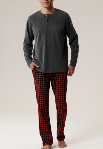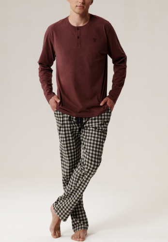 NMP-394 Пижама мужская Check, Стильная мужская пижама, состоящая из лонгслива с небольшой брендированной надписью на груди и штанов свободного, прямого кроя с классическим рисунком в виде клетки. Лонгслив имеет удобный круглый вырез и дополнен застежкой на пуговицах у горловины. Пояс штанов на резинке, объем талии регулируется с помощью завязок. Мягкий хлопок в составе данной модели мужских пижам очень приятен к телу и позволяет коже дышать. Идеально подходит для повседневной носки и в качестве подарка друзьям и близким.