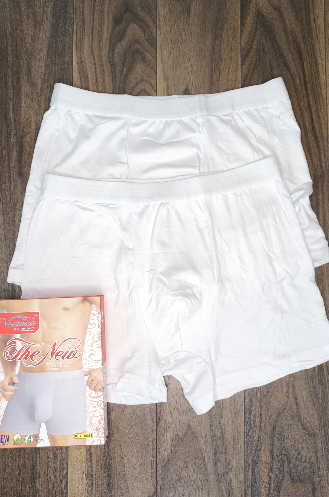 Мужские белые боксеры из мягкой эластичной хлопковой ткани с добавлением бамбуковой нити, пояс на широкой пришивной резинке. Производство Китай.