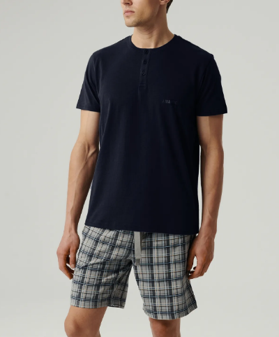 Мужская пижама Atlantic NMP-380 темно-синего и серого цветов из коллекции Homewear - стильный комплект из футболки и шорт для комфортного отдыха и повседневной носки. Комплект изготовлен из 100% хлопка с технологией "вычесывания" для повышенной прочности и эффектом "Peach Effect", создающим бархатистую поверхность для максимального комфорта. Шорты с классическим рисунком в клетку дополнены эластичным поясом на завязках и боковыми карманами, футболка с круглым вырезом легко сочетается с джинсами или спортивной одеждой. Доступны в различных расцветках: темно-синяя футболка с серыми шортами в клетку, денимовая с темно-синими. Натуральный хлопок обеспечивает воздухопроницаемость, отличное влагопоглощение и сохранение формы после стирок. Размерная сетка от S до 4XL, стильная упаковка делает комплект идеальным подарком для мужчин любого возраста.