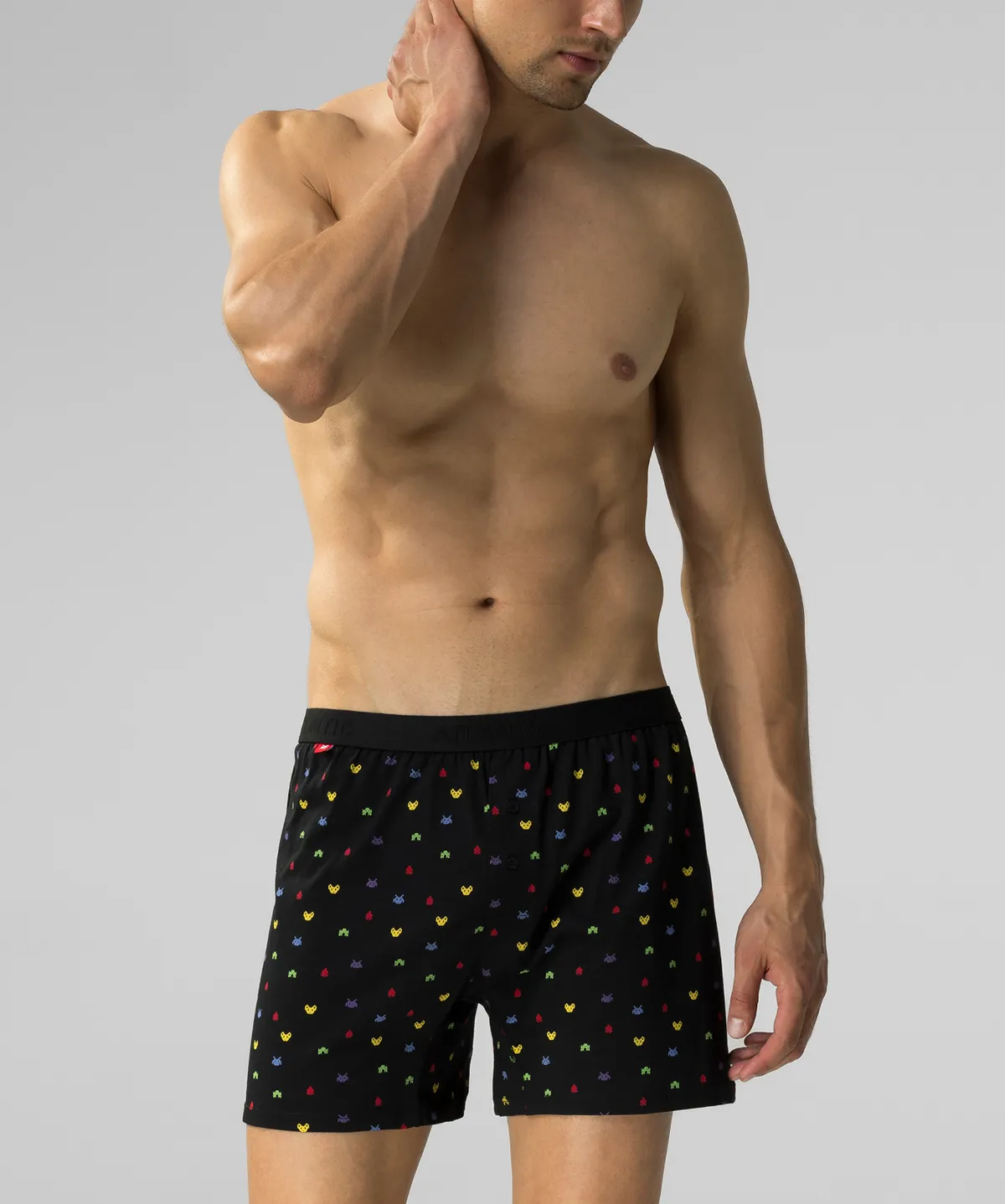 Набор из 2 шт. мужских трусов-боксеров Atlantic черного цвета. Мужские трусы-боксеры 2MBX-055 от польского бренда Atlantic на каждый день: превосходно подойдут абсолютно любому мужчине как для повседневной носки, так и для занятий спортом. Классический свободный крой этой модели гарантирует идеальную посадку по фигуре, свободу движений и максимальный комфорт. Внешняя пришивная резинка не давит, не скручивается и не натирает при носке. Свободные мужские боксеры имеют стандартную линию талии и штанины, доходящие до середины бедра, поэтому могут подойти к классическим брюкам или джинсам. В составе мужских семейных трусов используется мягкий, приятный на ощупь 100% хлопок. Трикотажное хлопковое полотно является прочным материалом, устойчивым к высоким температурам и растяжению, благодаря чему нижнее белье надолго сохраняет свой внешний вид и потребительские свойства. В упаковке представлено двое мужских боксерок в черной расцветке с мелким принтом в виде персонажей видеоигры Space Invaders; брендированная резинка из микрофибры обеспечивает приятные тактильные ощущения для кожи. Нижнее белье Атлантик будет превосходным подарком для мужчин всех возрастов: молодым парням и подросткам подойдут модели нижнего белья в яркой цветовой гамме и с паттерном или рисунком, более взрослым мужчинам - нижнее белье в сдержанных или строгих цветах, хотя иногда можно нарушить правила и поэкспериментировать. Только у нас Вы сможете приобрести трусы боксеры Атлантик 2MBX-055 из наличия по самым выгодным ценам. Широкая размерная сетка с самыми популярными (от S до XXL) и большими (3XL, 4XL) размерами, а также стильная фирменная упаковка нашего нижнего белья помогут однозначно сделать Вам верный выбор!