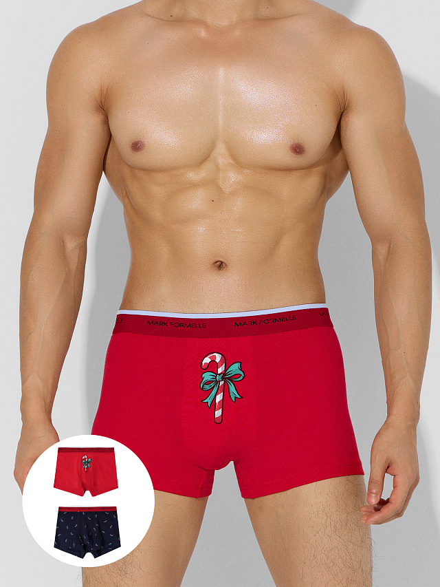 Набор из двух мужских трусов-боксеров с новогодним принтом создаст праздничное настроение в повседневной жизни. В комплект входят две модели: яркие красные с крупным рисунком леденца и насыщенные синие с узором из миниатюрных конфет. Оба принта сохраняют новогоднюю атмосферу, оставаясь при этом лаконичными и стильными.