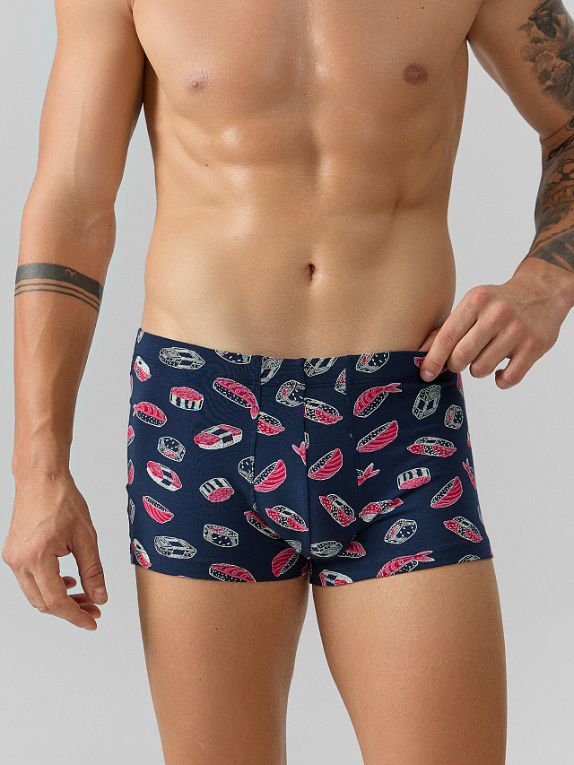 Эластичная тесьма по верхнему краю мягко фиксирует изделие на талии, а обработка швов предотвращает натирание и обеспечивает максимальный комфорт. Эти трусы боксеры мужские синие с принтом отличаются не только практичностью, но и ярким дизайном — принт с суши добавляет образу легкости. Если вы хотите купить мужские трусы боксеры, которые сочетают качественные материалы, продуманную конструкцию и современный стиль, эта модель станет отличным выбором.