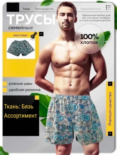 Ткань: бязь; Состав: 100% хлопок, плотность 115 ± 5 г/м2; Сезонность: всесезон; Стиль: домашний, классический, повседневный, рабочий; Модель трусов: семейные; Тип посадки: средняя; Производство: г. Иваново; Тип изделия: трусы; Цвет: в ассортименте
