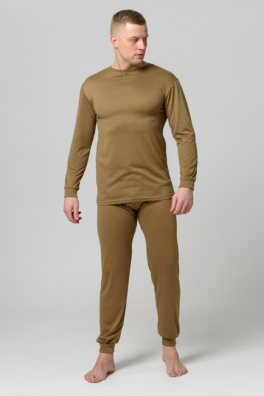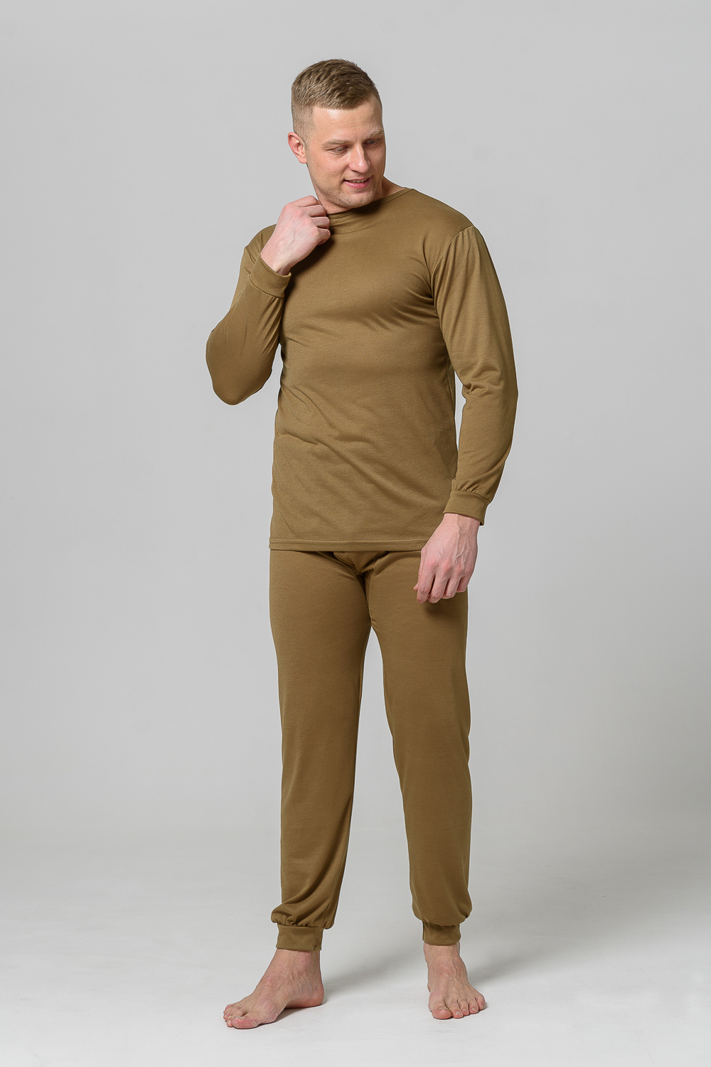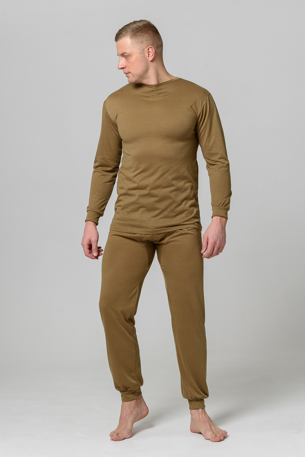 Комплект состоит из фуфайки и кальсон. Фуфайка прямого силуэта. Рукава втачные одношовные с притачными манжетами. Вырез горловины округлой формы, окантован бейкой. Кальсоны без боковых швов с двойным гульфиком, двойной ластовицей и одинарной вставкой сзади. По низу кальсон манжеты. Вырез гульфика окантован бейкой. По верху кальсон проложена эластичная лента Цвет: хаки; Материал: кулирка;полиэстер;кулирка;полиэстер; Состав: ПЭ 100%.