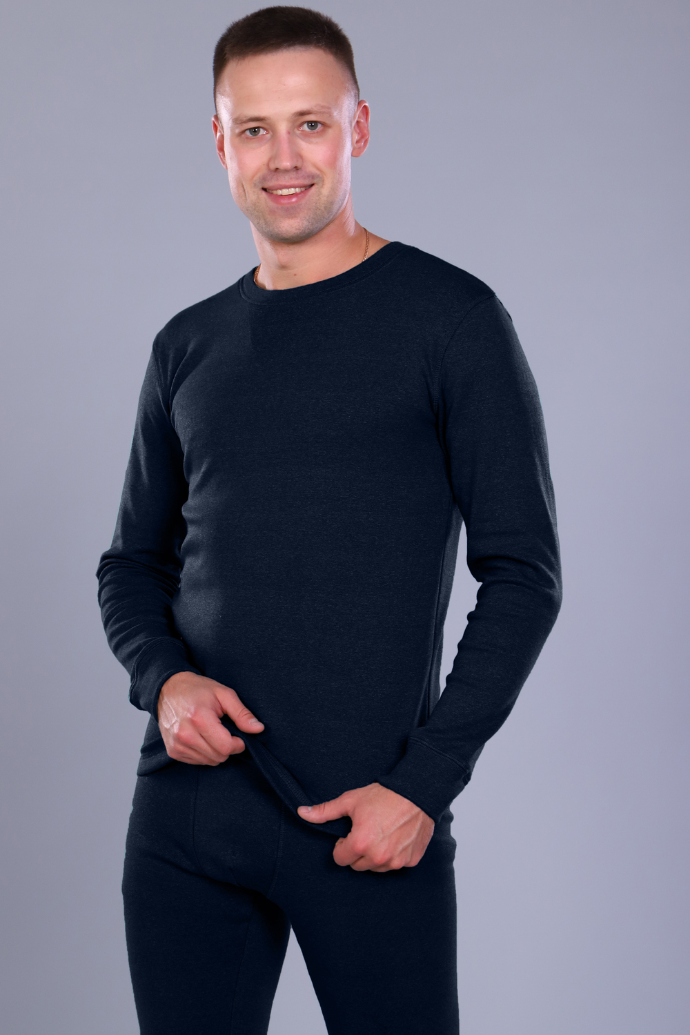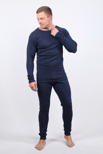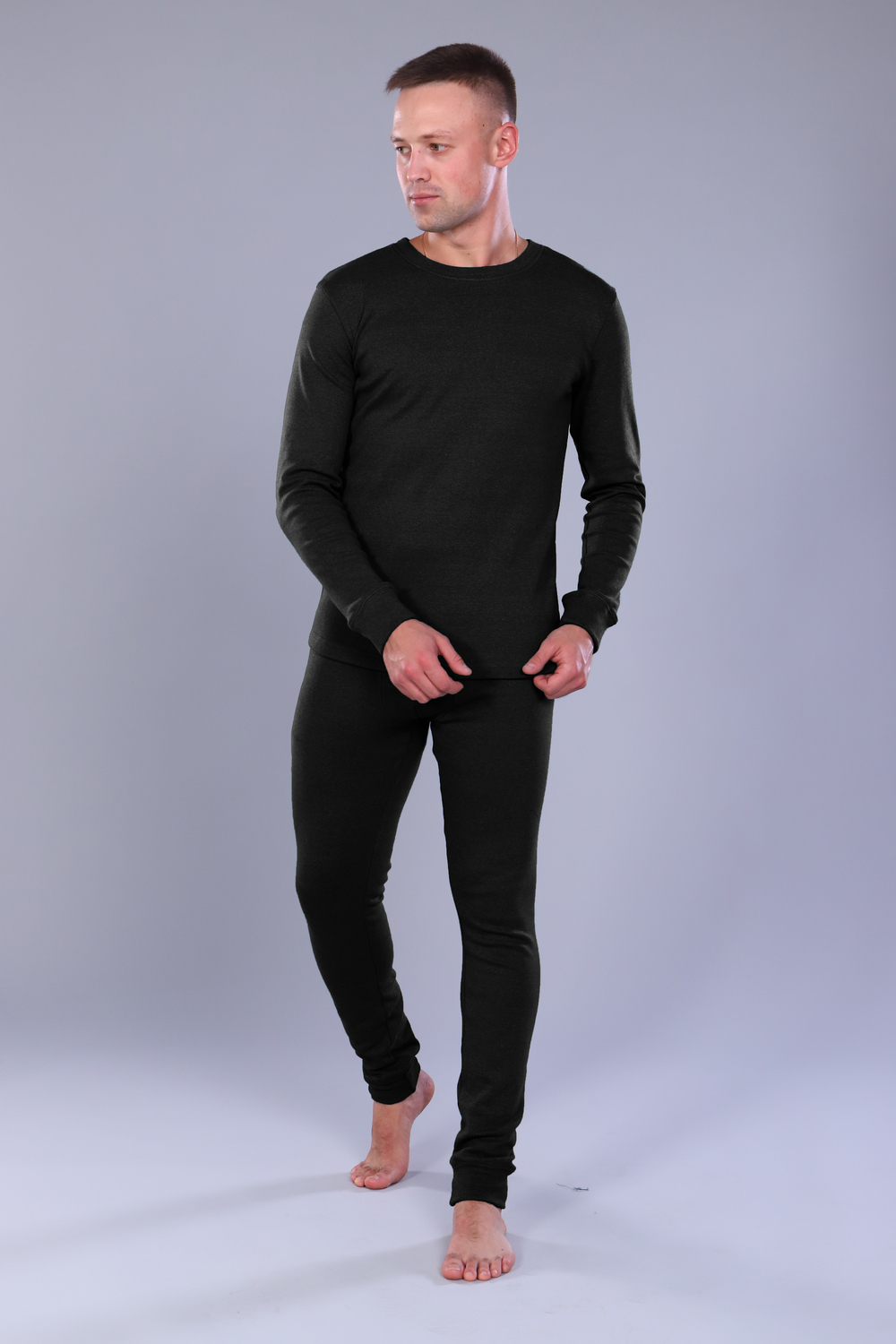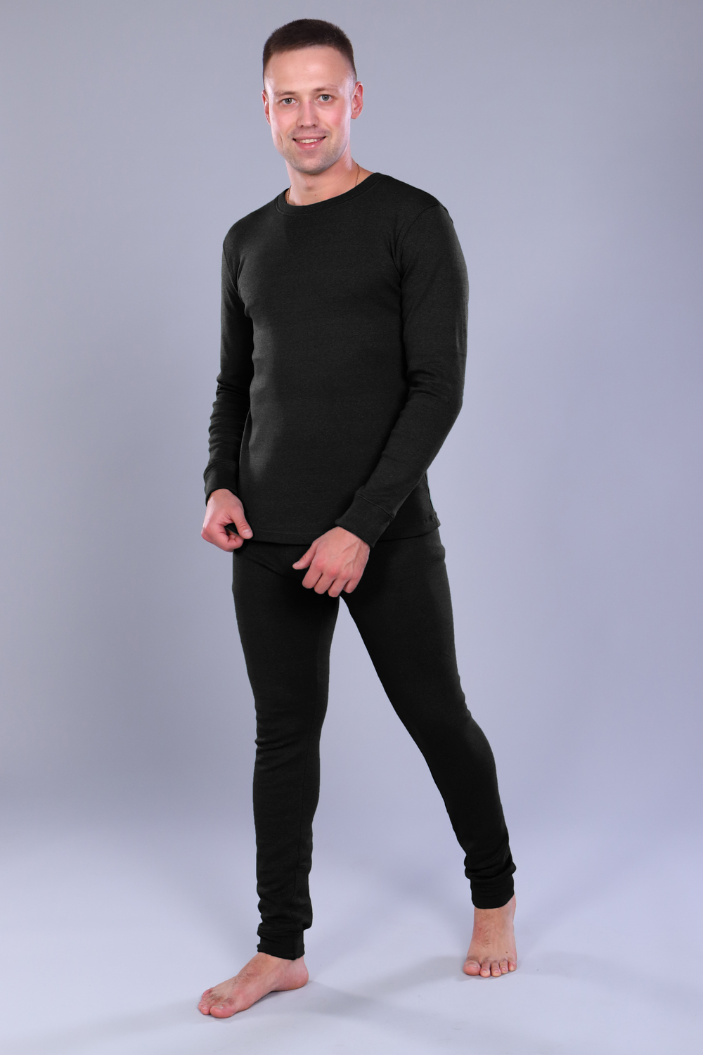 Нательное белье с фуфайкой и кальсонами. Горловина фуфайки с отделкой обтачка, рукава с манжетами. Кальсоны на резинке с ластовицей и манжетами внизу. Цвет: черный; Материал: интерлок;интерлок; Состав: 70 % хлопок, 25% Пэ, 5% лайкра.