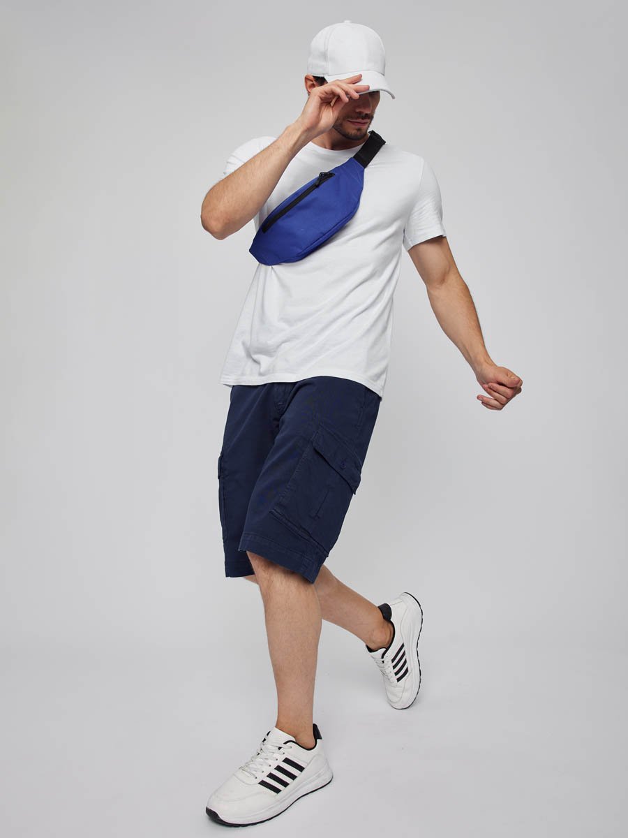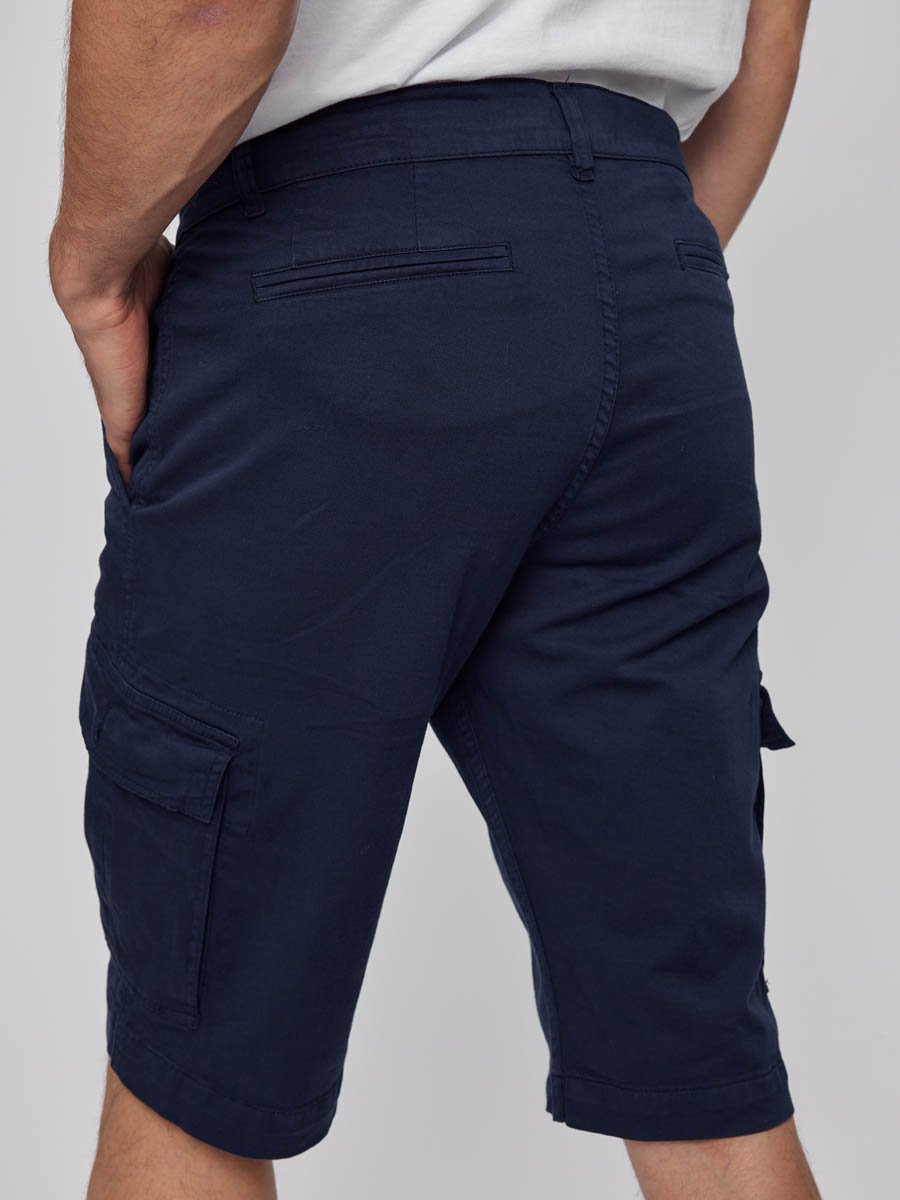 Мужские шорты-карго. Посадка Comfort fit (свободные по бедру), средняя посадка по талии спереди и высокая сзади, прямые к низу. Застежка на молнии. Шорты имеют боковые косые карманы, по бокам накладные карманы с клапаном застегивающиеся на пуговицу, сзади имитация прорезных карманов. Выполнены из слабоэластичной плотной ткани gabardine stretch. Крашение Garment dayed, т.е. покрашены в готовом виде после пошива.