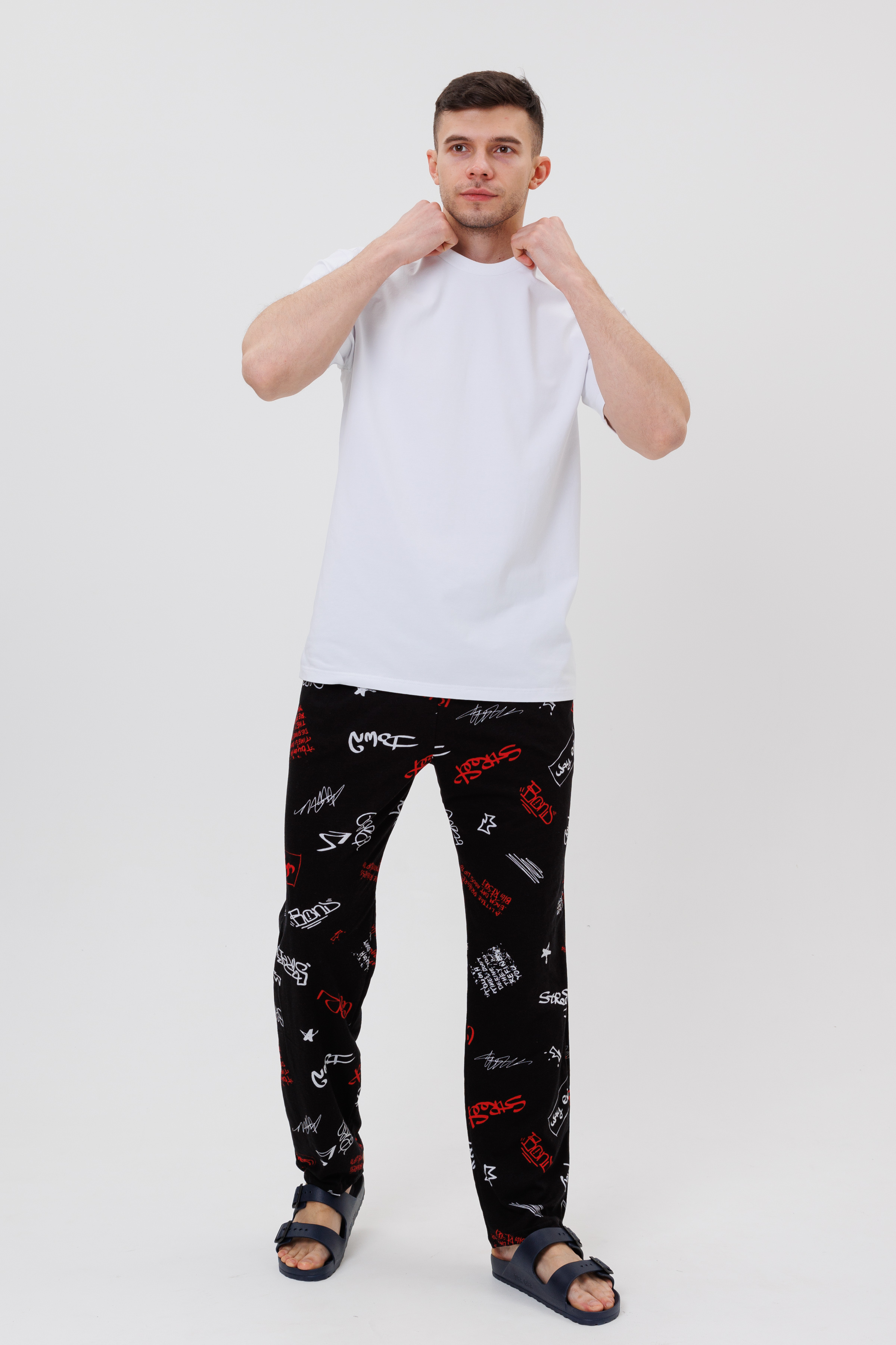 Мужские брюки свободного кроя с карманами в боковых швах. Пояс выполнен из ткацкой резинки с принтом.