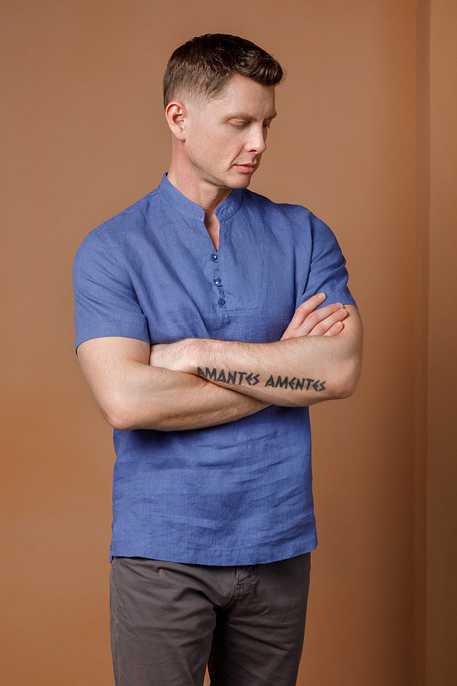 Совсем не типичный декор для мужской сорочки демонстрирует представленная модель. Согласитесь, весьма надоели заурядные футболки, майки и рубашки. А эта модель с её застёжкой, воротником стойкой и вставкой на полочке – прекрасна альтернатива для отдыха.