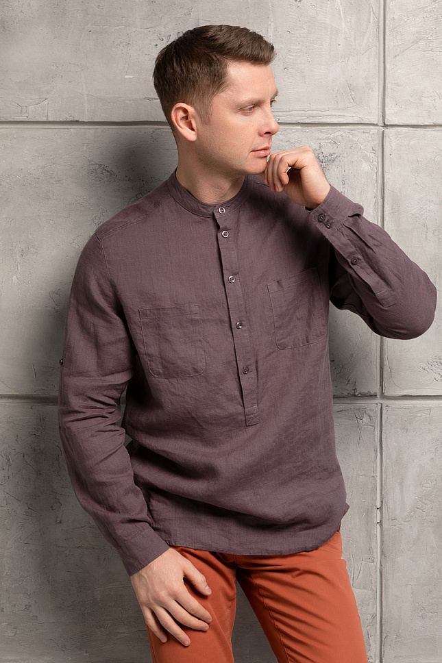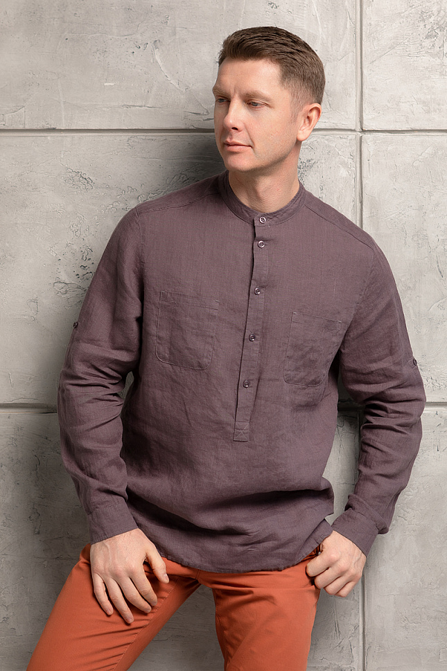 Если вы полагали, что атрибуты классического мужского костюма не способны к трансформации- вы ошибались. Возможности современной моды настолько велики и многогранны, что способны радовать и удивлять новинками каждый сезон. Вот и мужская сорочка не перестаёт меняться. Обратите внимание на представленную модель рубашки от Kayros! Гладкий, почти шелковистый поплин, сатин и твилл заменён на чуть небрежный лён, с его стильной жатой текстурой. Центральная планка на пуговицах трансформирована в застёжку-поло, привнося в модель большую лёгкость и меньшую чопорность. При таком решении уместно выглядит воротник стойка, который поддерживает лаконичность линий и форм. Длину рукава можно легко корректировать при помощи хлястика, расположенного с изнаночной стороны. Накладные карманы и изогнутый нижний срез намекает нам о стиле кэжуал, который «придётся по вкусу» любому мужчине и впишется в любой самый брутальный гардероб. Полуприлегающий силуэт рубашки способен хорошо сочетаться с самыми разнообразными брюками и джинсами.