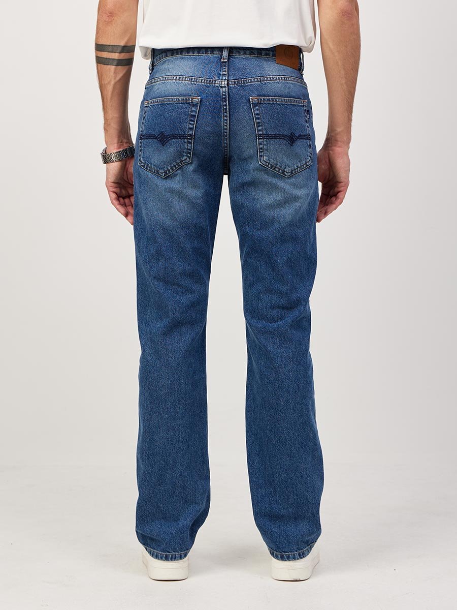 Мужские классические джинсы с пятью карманами. Эта модель выпускактся уже более 25-ти лет и все годы пользуется неизменной популярностью у наших покупателей. Посадка Regular fit (полуоблегающие по бедру), высокая талия, немного заужены к низу. Застежка на молнии. Выполнены из традиционной хлопковой ткани denim. Классическая темная стирка "stone wash".