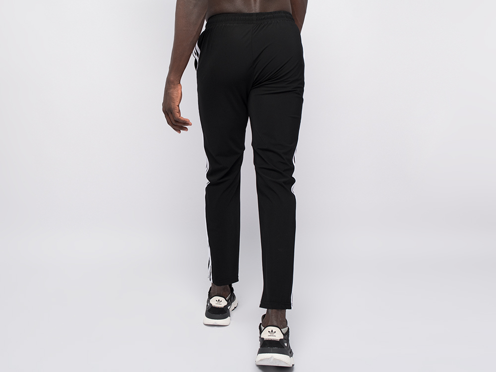 образ фирменные полосы по бокам и логотип на передней части брючин.