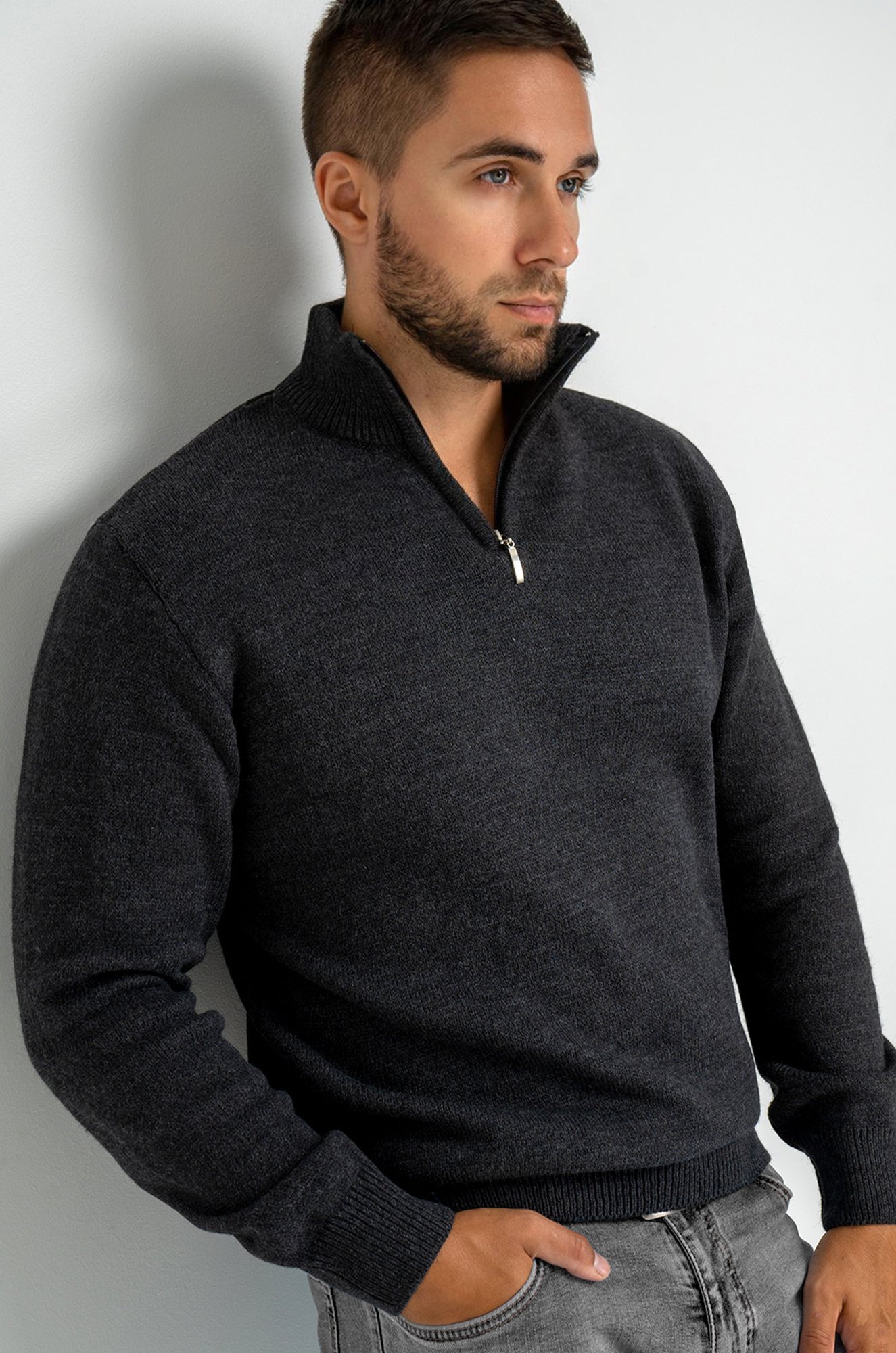 Однотонный му..показатьжской джемпер с воротником-стойкой на молнии идеален для создания повседневных образов.