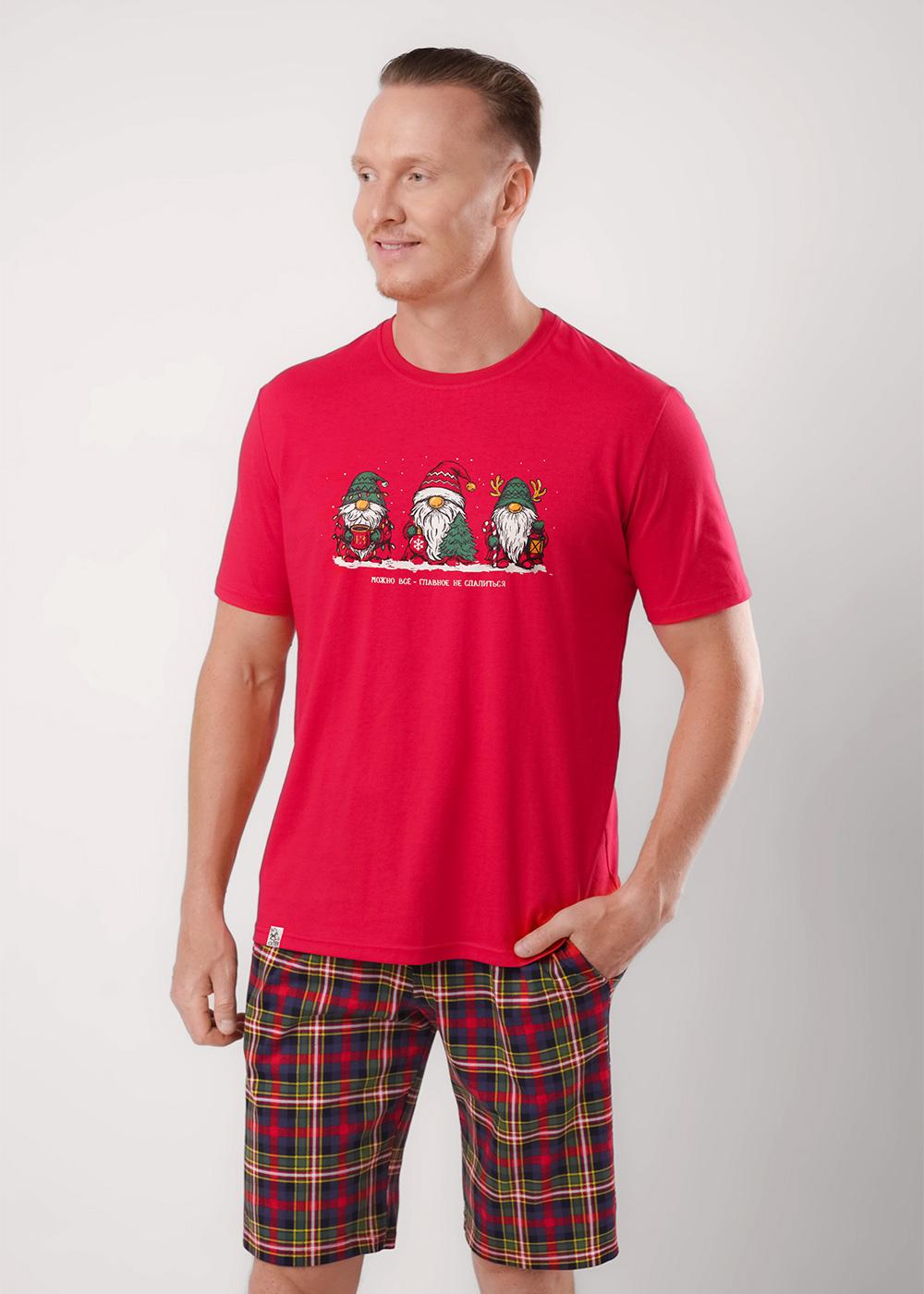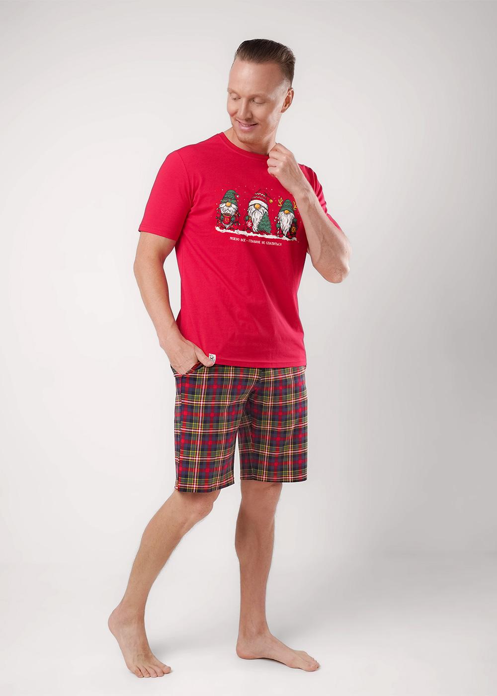 "Описание: Набор, состоящий из футболки и шорт. Футболка из хлопковой кулирной глади с округлой горловиной, коротким рукавом и дизайнерским принтом. Шорты в клетку из кулирной глади с карбоном на эластичном поясе с функциональными карманами и шнуром.