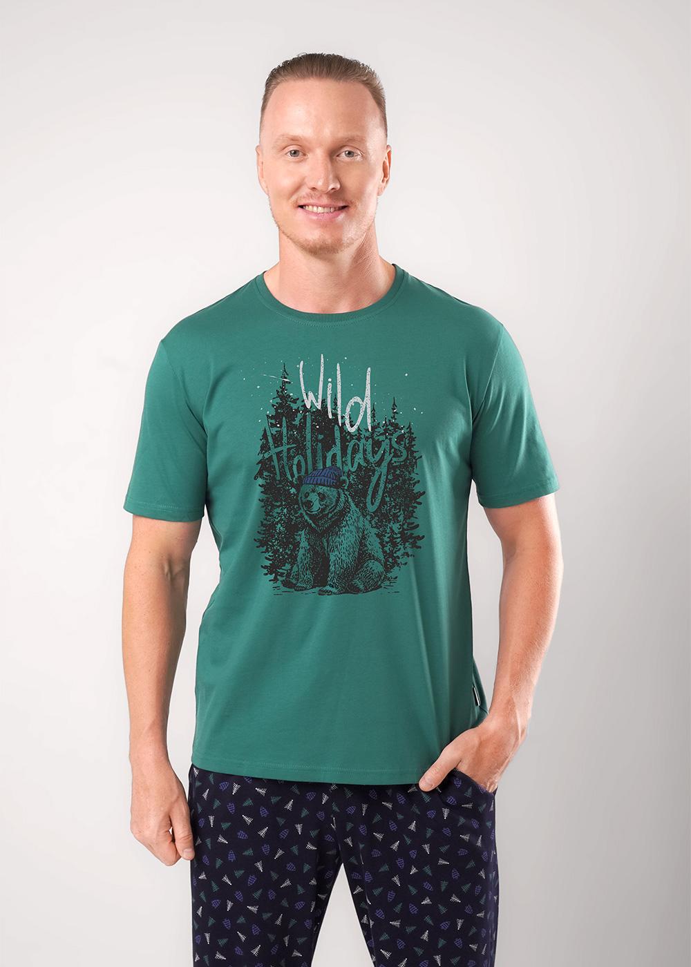 "Описание: Набор мужской состоящий из футболки и брюк. Футболка из хлопковой кулирной глади с коротким рукавом спереди авторский принт. Брюки прямые из набивной кулирной глади на широком поясе с резинкой и шнуром, по бокам удобные карманы.