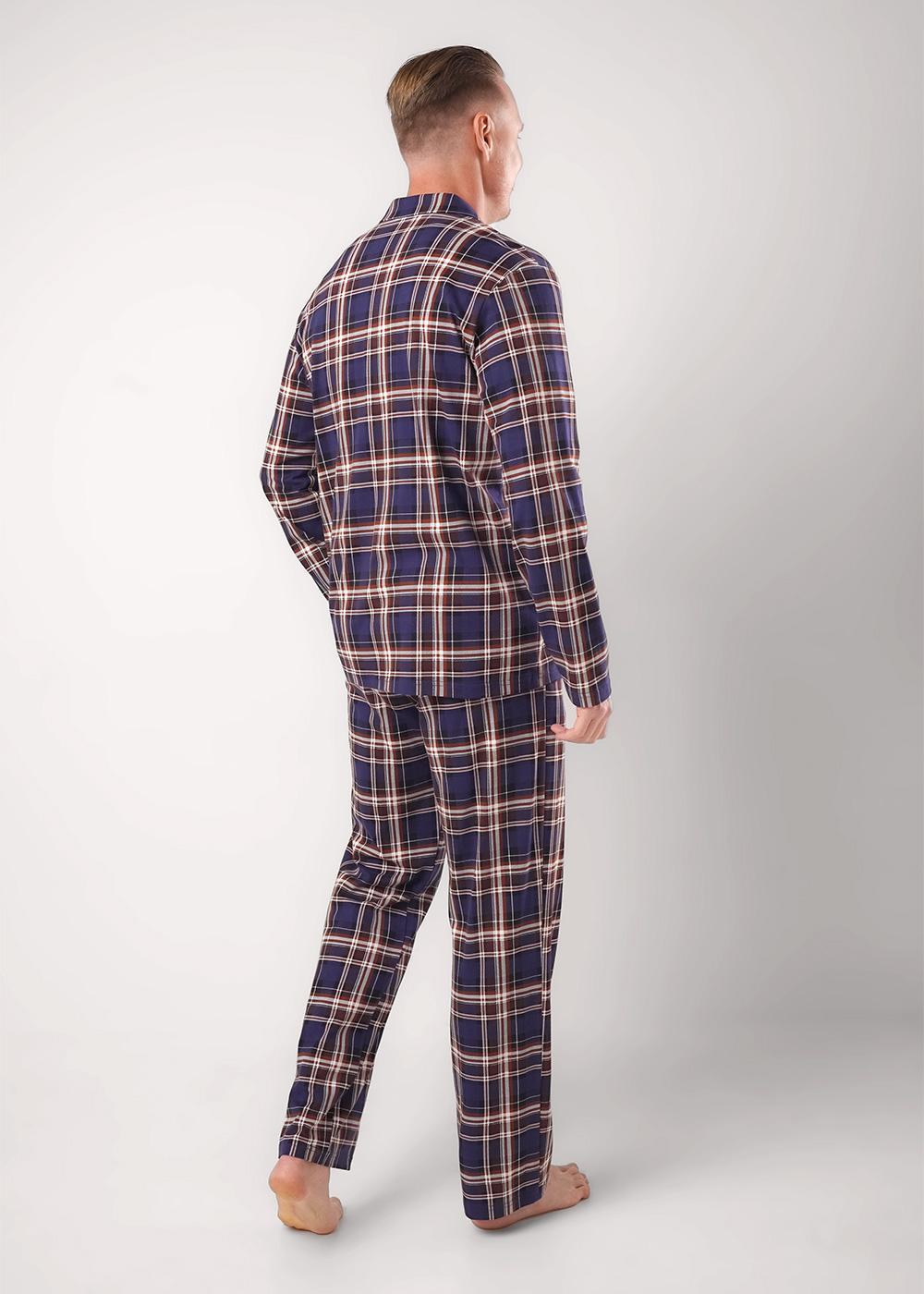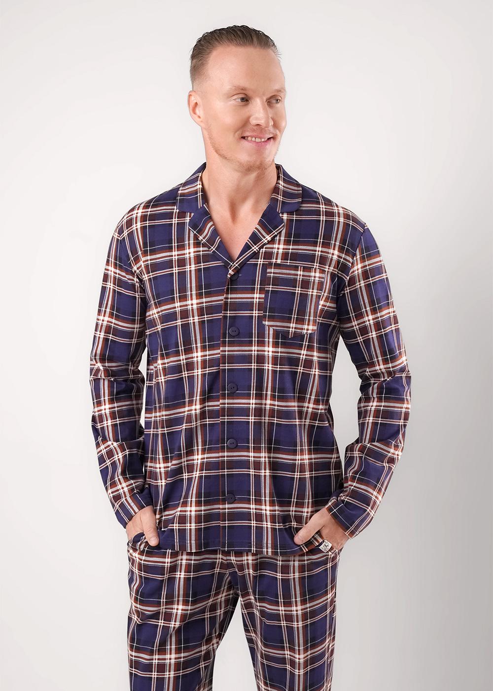 "Описание: Пижама в оригинальную клетку из мягкого трикотажа с карбоном. Жакет с застежкой на пуговицы, отложным воротником и карманом. Прямые брюки с эластичным поясом, шнуром для регулировки по размеру и двумя функциональными карманами по бокам.