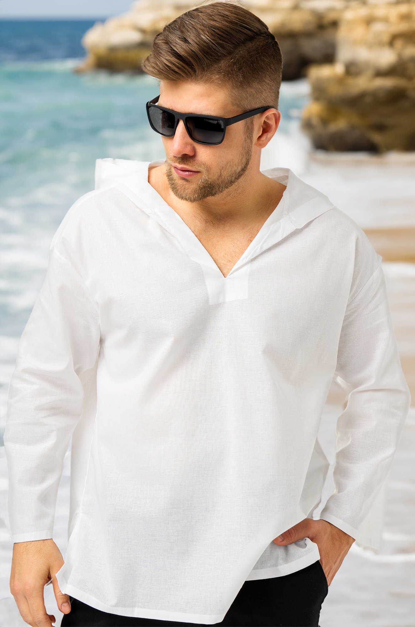 Море, солнце и песок! Хлопковая мужска..показатья туника спасет от знойных солнечных лучей во время отдыха на пляже, природе и на даче. Белая эко-туника с длинными широкими рукавами выполнена из тончайшего ситца. Объемный капюшон защитит голову от перегрева.