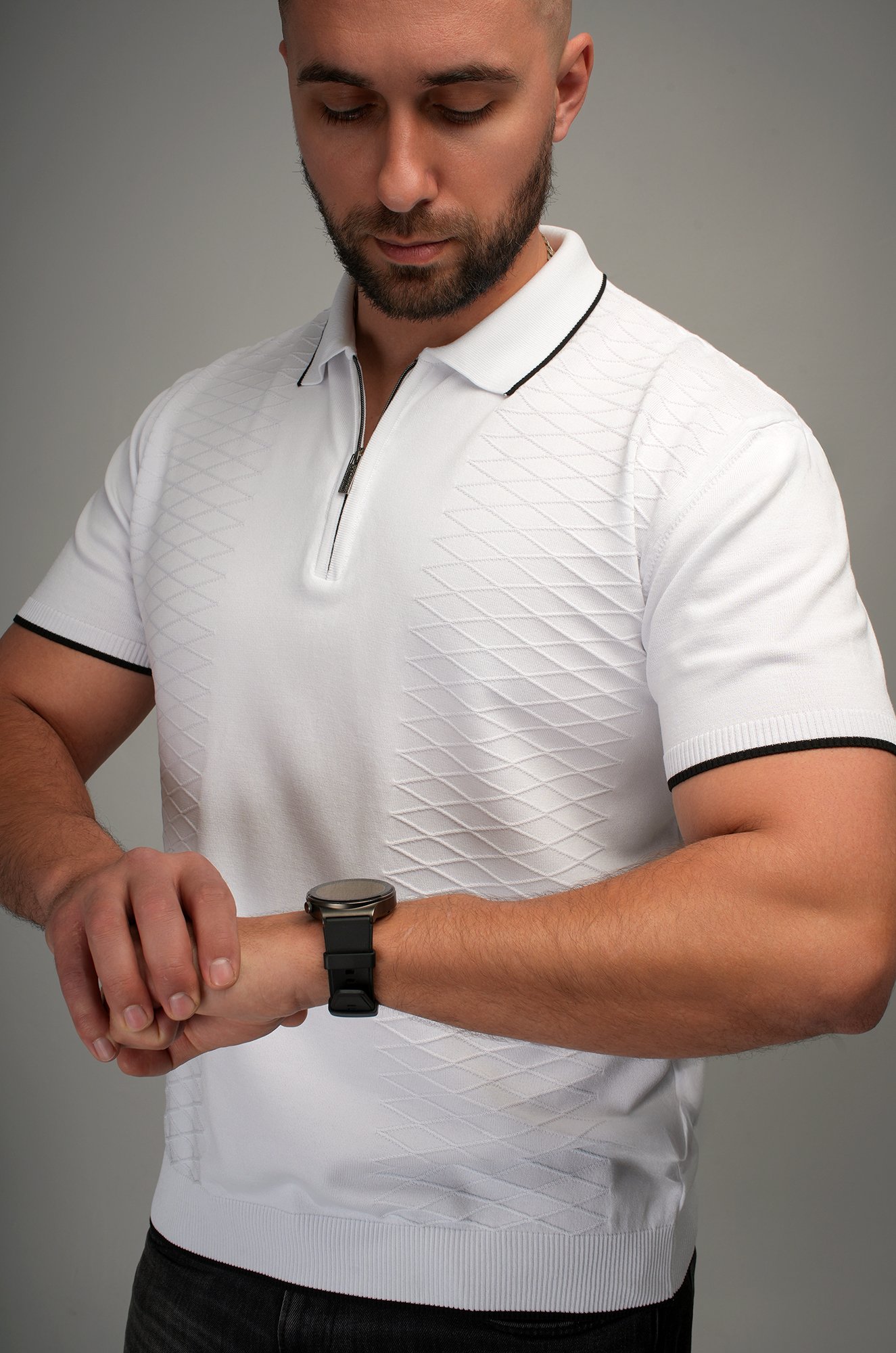 Мужская футболка — идеальный спутник для жарких дней. Фактурная текстура, стильный воротник с замком и контрастная окантовка добавляют образу элегантности. Белое поло – отличный выбор для мужчин, которые любят сочетать комфорт и эффектный внешний вид. Футболка с коротким рукавом – прекрасный вариант на лето и весну.