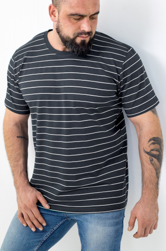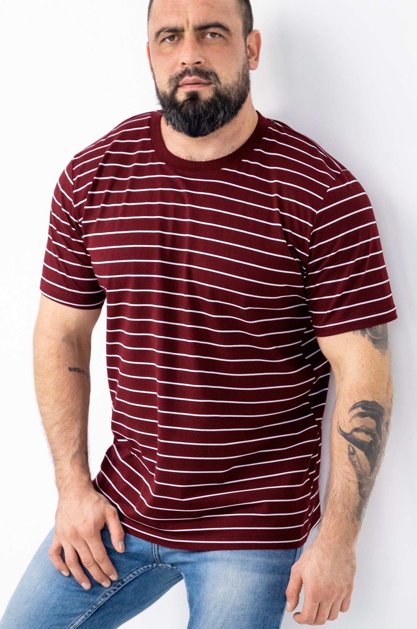 Полосатая мужская футболка в приятной ..показатьбордовой гамме – отличный базовый вариант. Мягкий трикотаж супрем с высоким содержанием хлопка приятный на ощупь и хорошо держит форму.