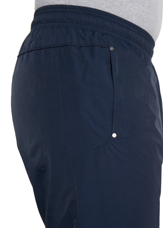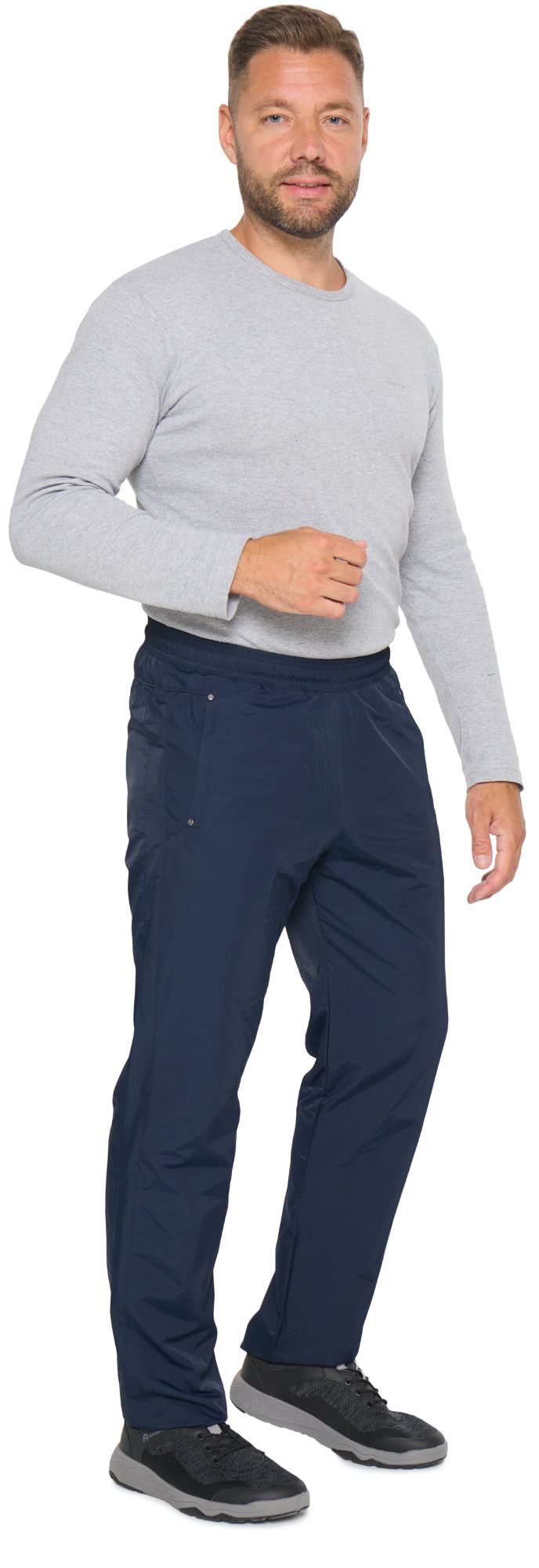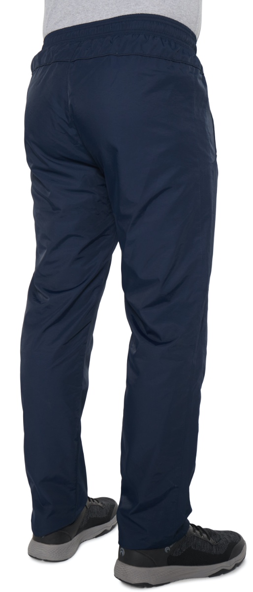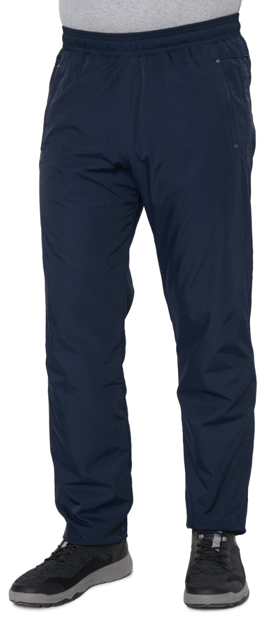 Спортивные утеплённые брюки с поясом на резинке. Ткань со специальной обработкой наружной стороны и полиуретановым покрытием на внутренней стороне обеспечивает защиту от ветра и влаги. Брючины прямые. С внутренней стороны пояс фиксируется шнурком. Для облегчения входа в брючины подкладка из кулирки в нижней части заменена таффетой. Передние карманы на молниях под листочками, усиленными по краям хольнитенами. Сзади кокетка, декорированная кантом.