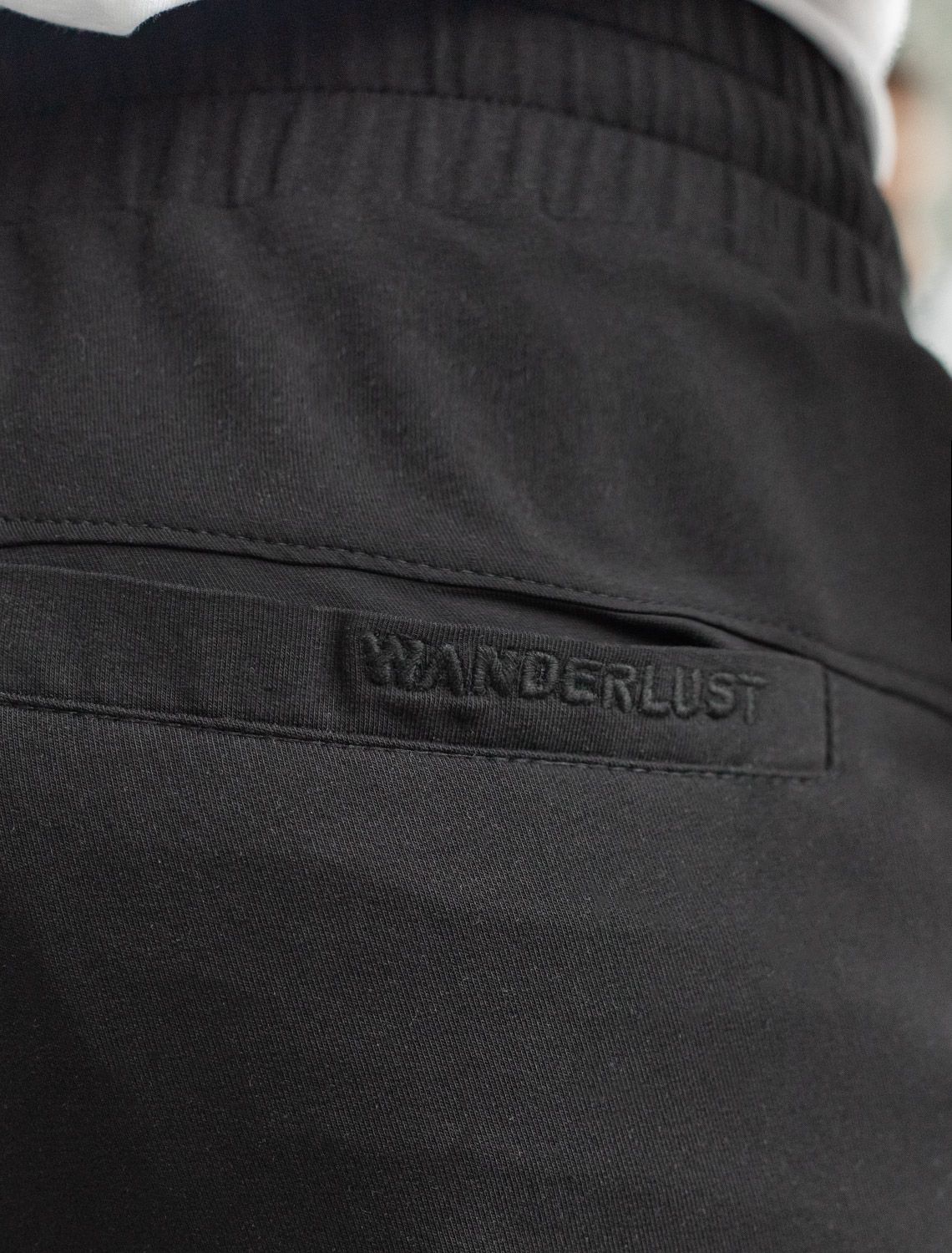 Свободные джоггеры черного цвета созданы для максимального комфорта на каждый день. Брюки выполнены из натуральной ткани — премиального футера двухнитки, дополнены эластичным поясом со шнуром, двумя карманами на молнии по боками и задним карманом с минималистичной вышивкой в тон брюкам. Перевод надписи Wanderlust - Страсть к путешествиям . Брюки визуально вытягивают силуэт за счет декоративных застроченных стрелок. Эластичный качественный хлопок обеспечивает приятное ощущение, прилегая к телу, а также позволяет коже дышать. Ткань отличается высокой износостойкостью, не деформируется после стирки, сохраняет форму и внешний вид даже при активной носке.