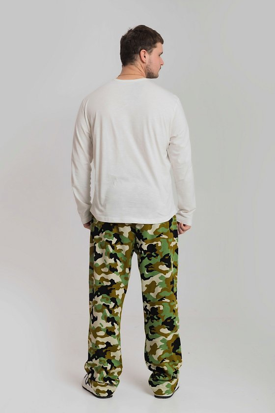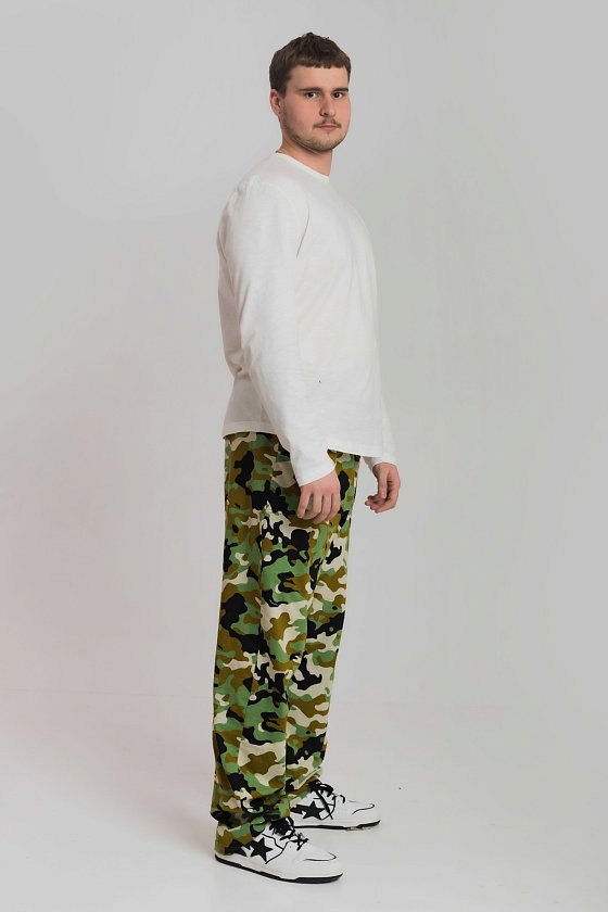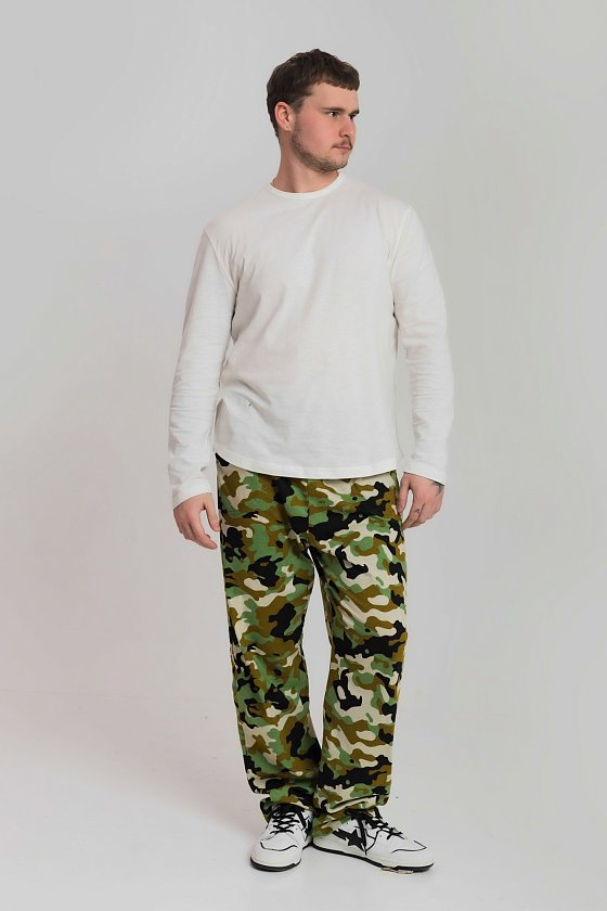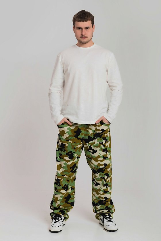 Брюки мужские из хлопкового полотна (камуфляж). Прямого кроя, с карманами по бокам. Пояс брюк на резине.