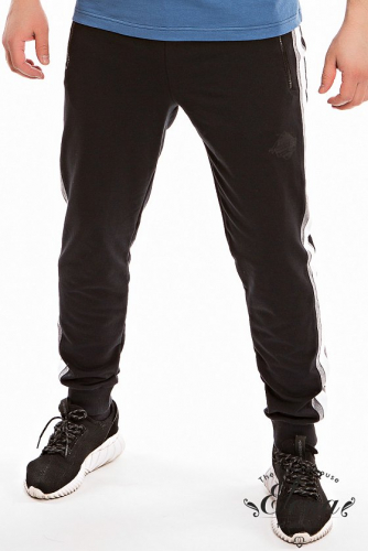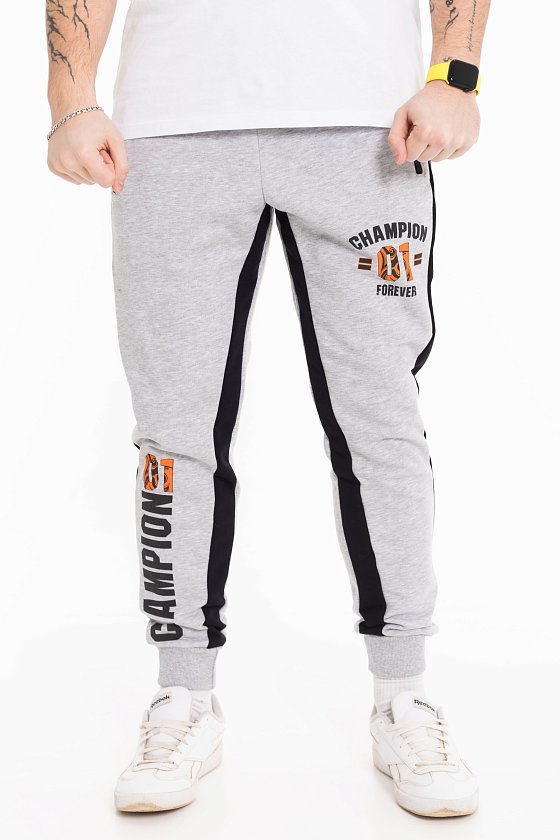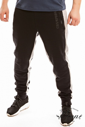 Брюки из полотна футер петля трёхнитка. По бокам и шаговому шву контрастные вставки. Пояс притачной, через люверсы продернут широкий шнур. Внизу брюки на манжетах. На передних половинках расположены боковые карманы с молниями и принт.