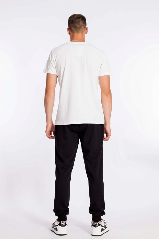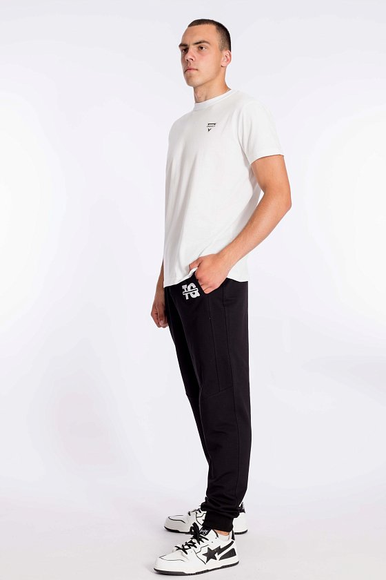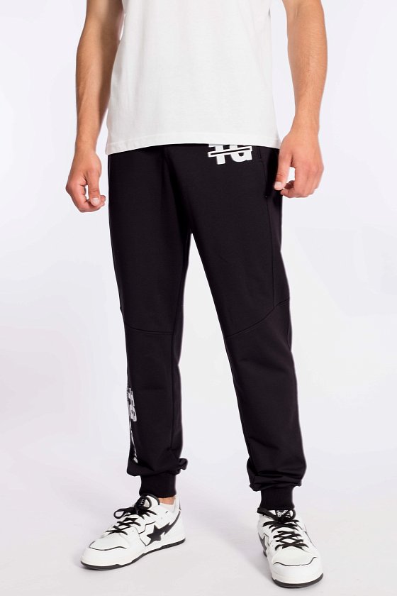 Мужские брюки выполнены из футер петли с лайкрой. Пояс брюк на резинке, по бокам размещены карманы. Низ брюк на манжетах, спереди нанесён принт.
