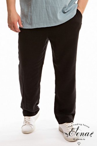 Мужские брюки выполнены из хлопкового полотна - муслина. Пояс притачной на резине и шнуре, по бокам размещены карманы. Низ брюк собран на резинку.