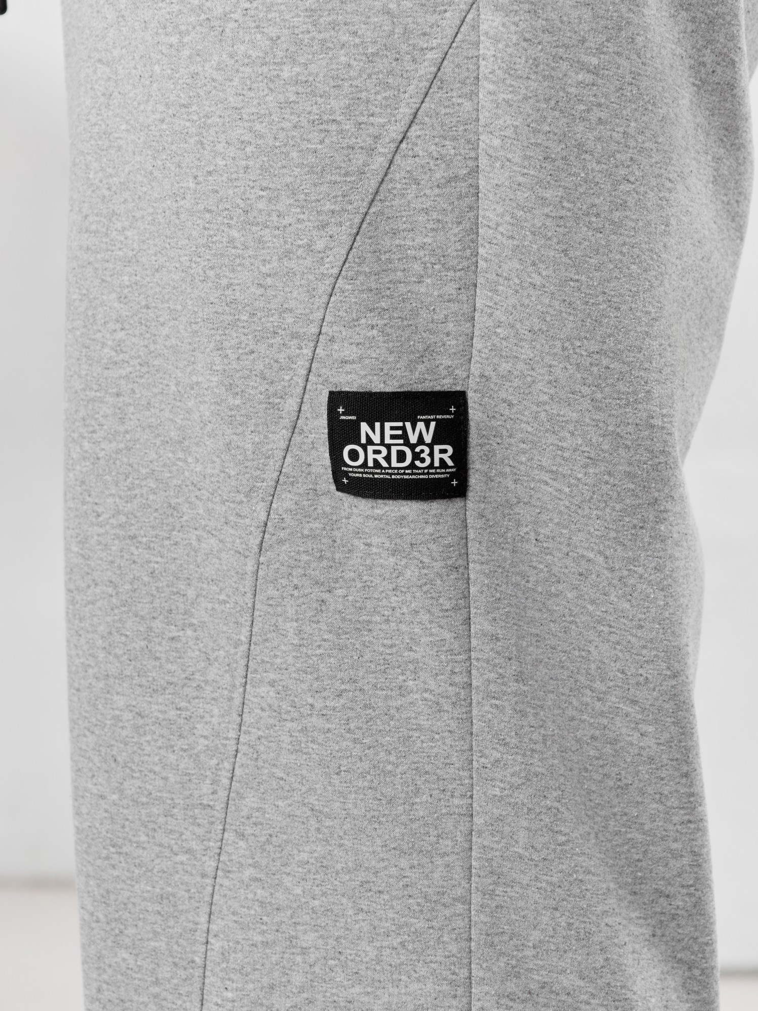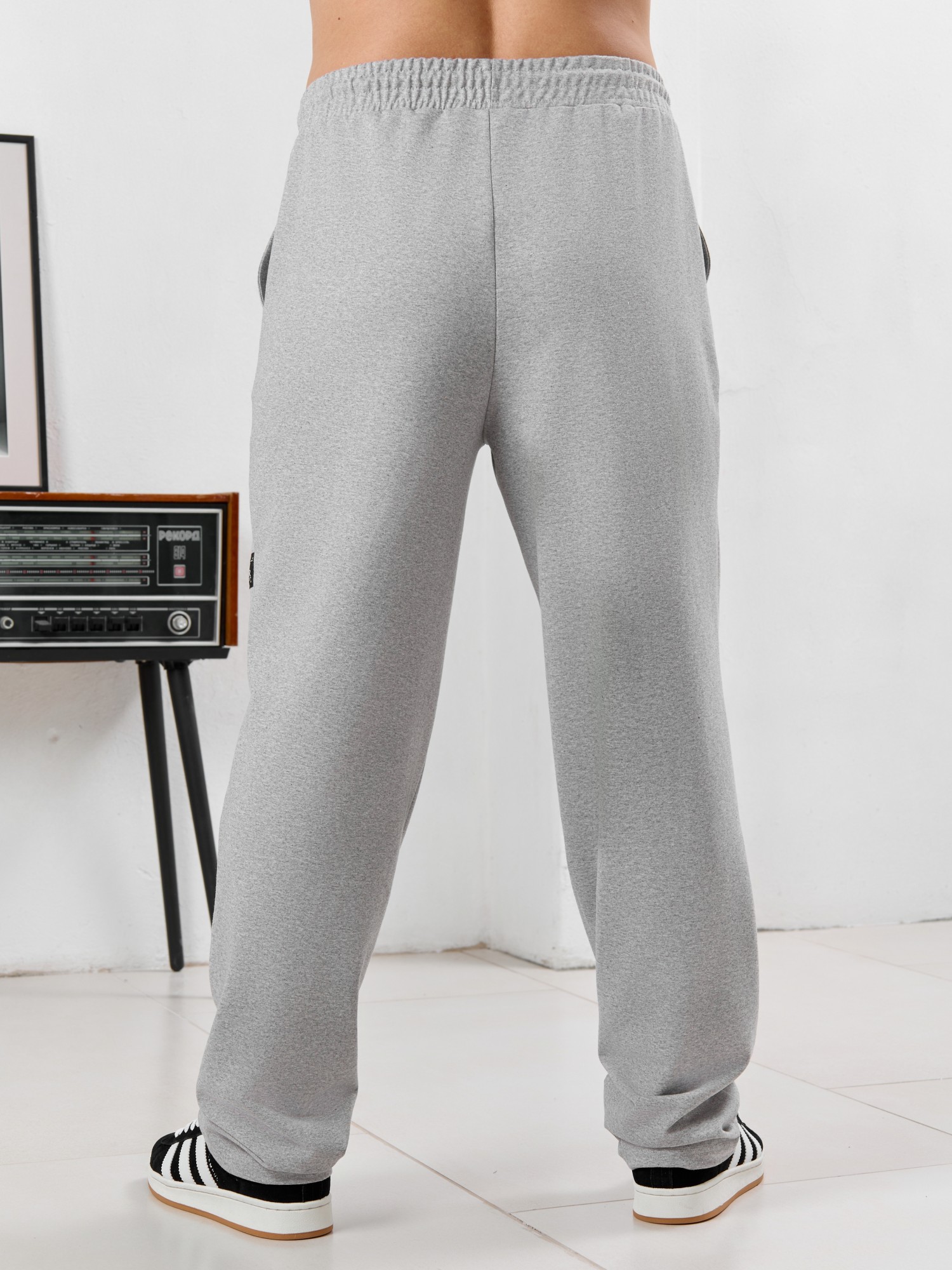 Брюки мужские прямого силуэта, из трикотажного полотна «футер двунитка с лайкрой». Модель с рельефными швами по передним деталям, декоративной «нашивкой», с карманами в боковых швах, на притачном поясе с отстроченной эластичной тесьмой и шнуром для регулирования степени прилегания изделия по линии талии, продетым через две обметанные петли в центре пояса.