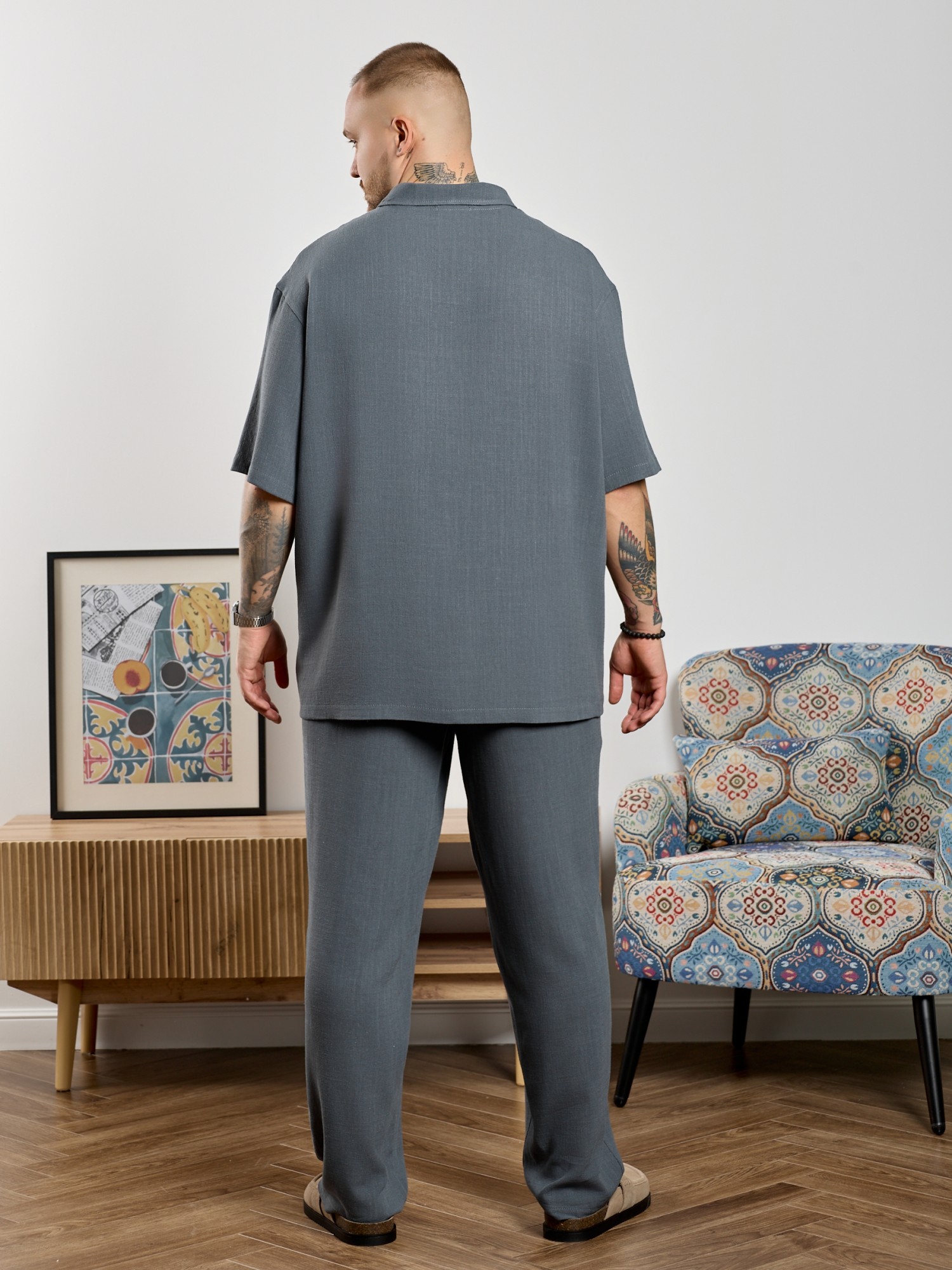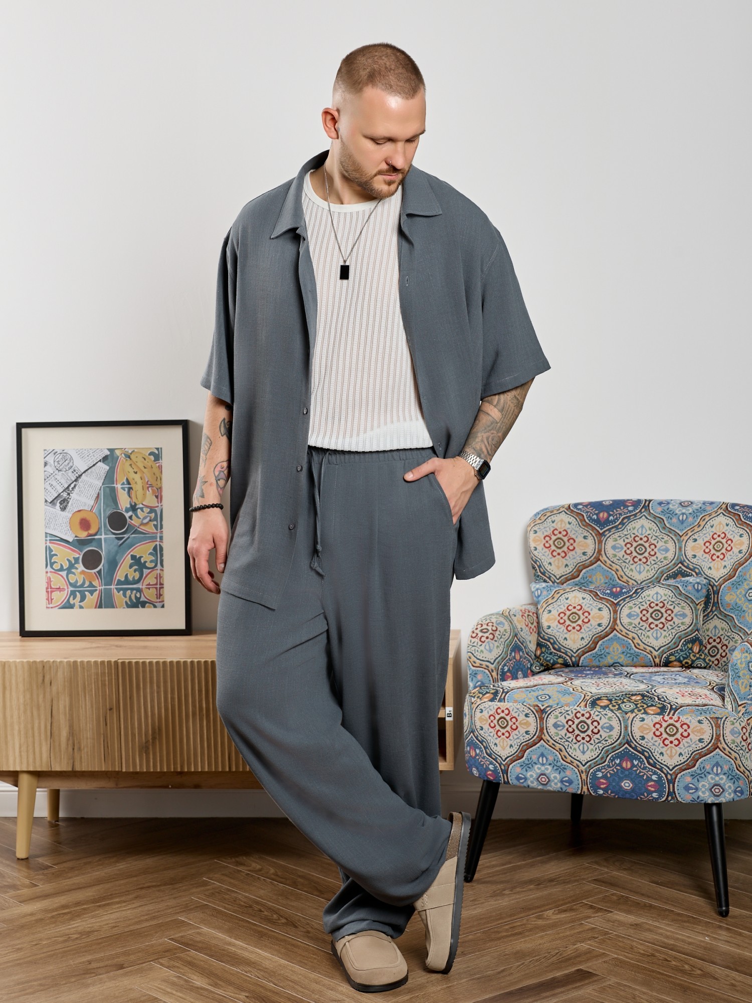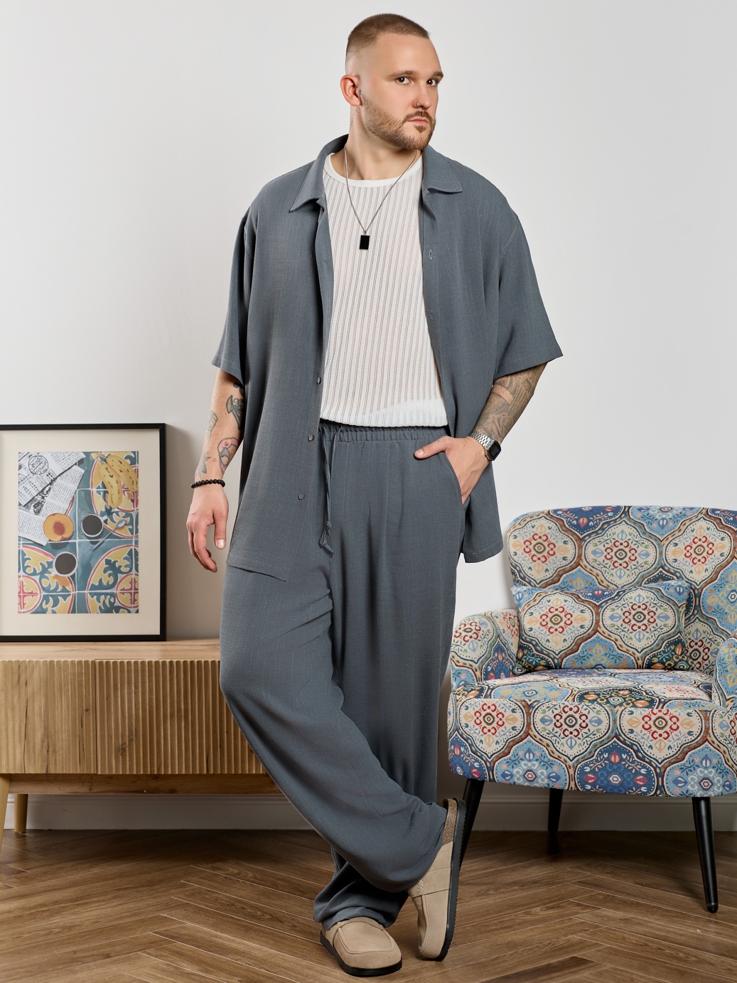Брюки мужские из фактурного полотна на притачном поясе с эластичной тесьмой внутри, с карманами в боковых швах. Средний шов передней половины выполнен с имитацией застежки "гульфик". Для регулирования степени прилегания изделия в области талии предусмотрен шнурок из основной ткани, вставленный в пояс через две обметанные петли. Нижние срезы брюк обработагны подгибкой.