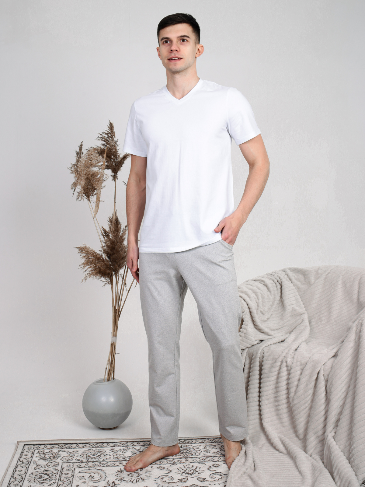 Мужские трикотажные брюки из эластичного, немнущегося, износостойкого и прочного трикотажа, шелковистого и приятного на ощупь. Впереди два кармана. Мешковина карманов выполнена из основного полотна, что и само изделие. Брючины внизу прямого покроя. Пояс на эластичной ленте с шнурком, что позволяет его дополнительно регулировать по объему. Подойдут для повседневного использования, прогулок, поездок на отдых.