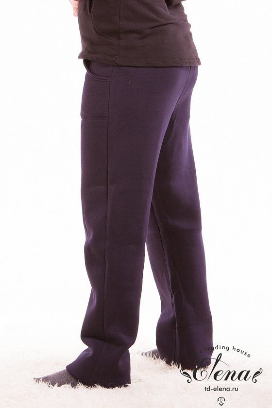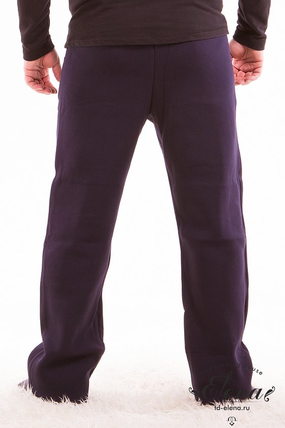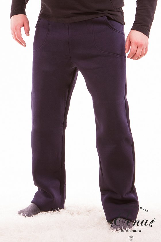 Мужские брюки с карманами по бокам выполнены из полотна с начёсом. Пояс брюк на резинке.