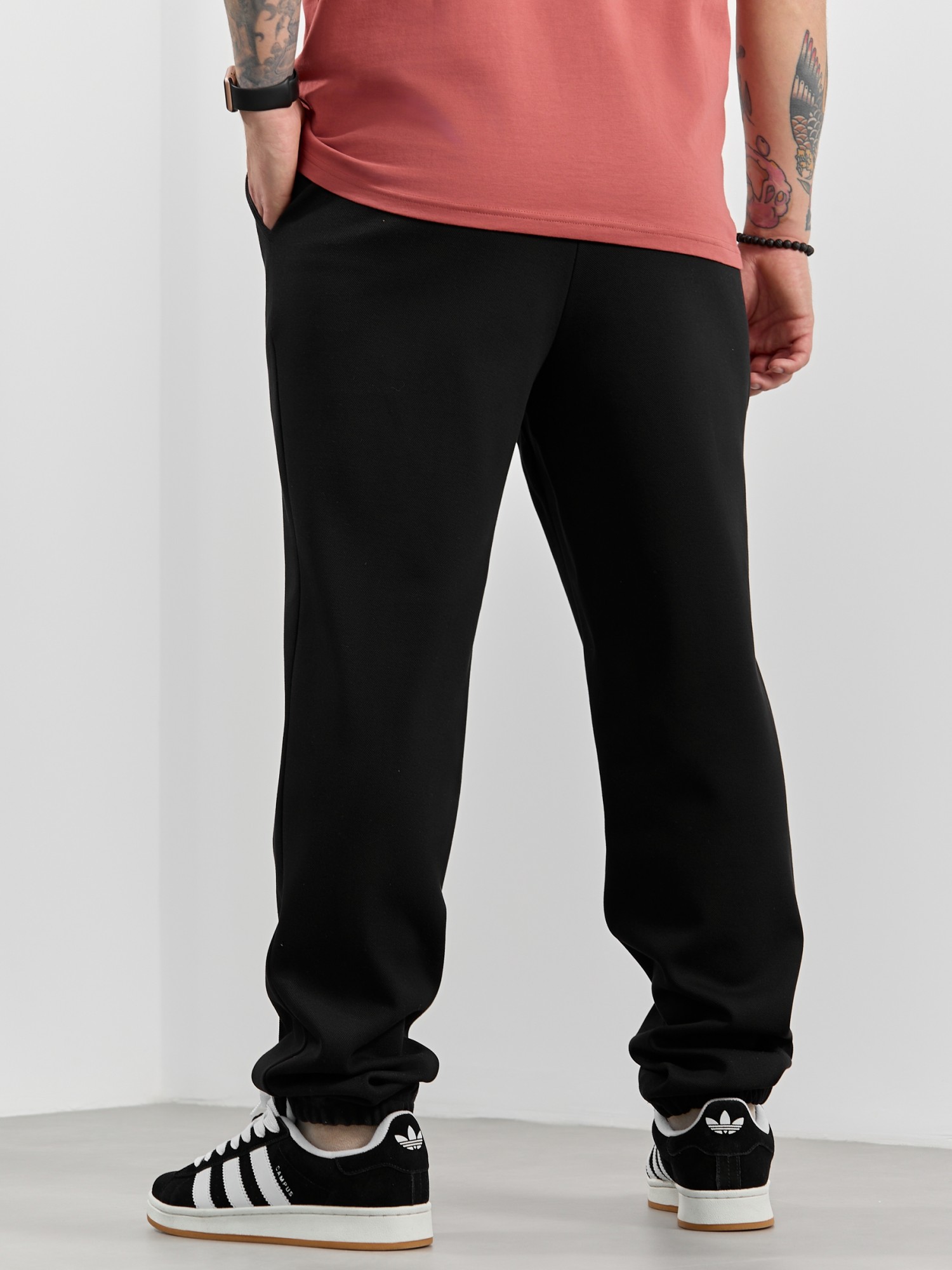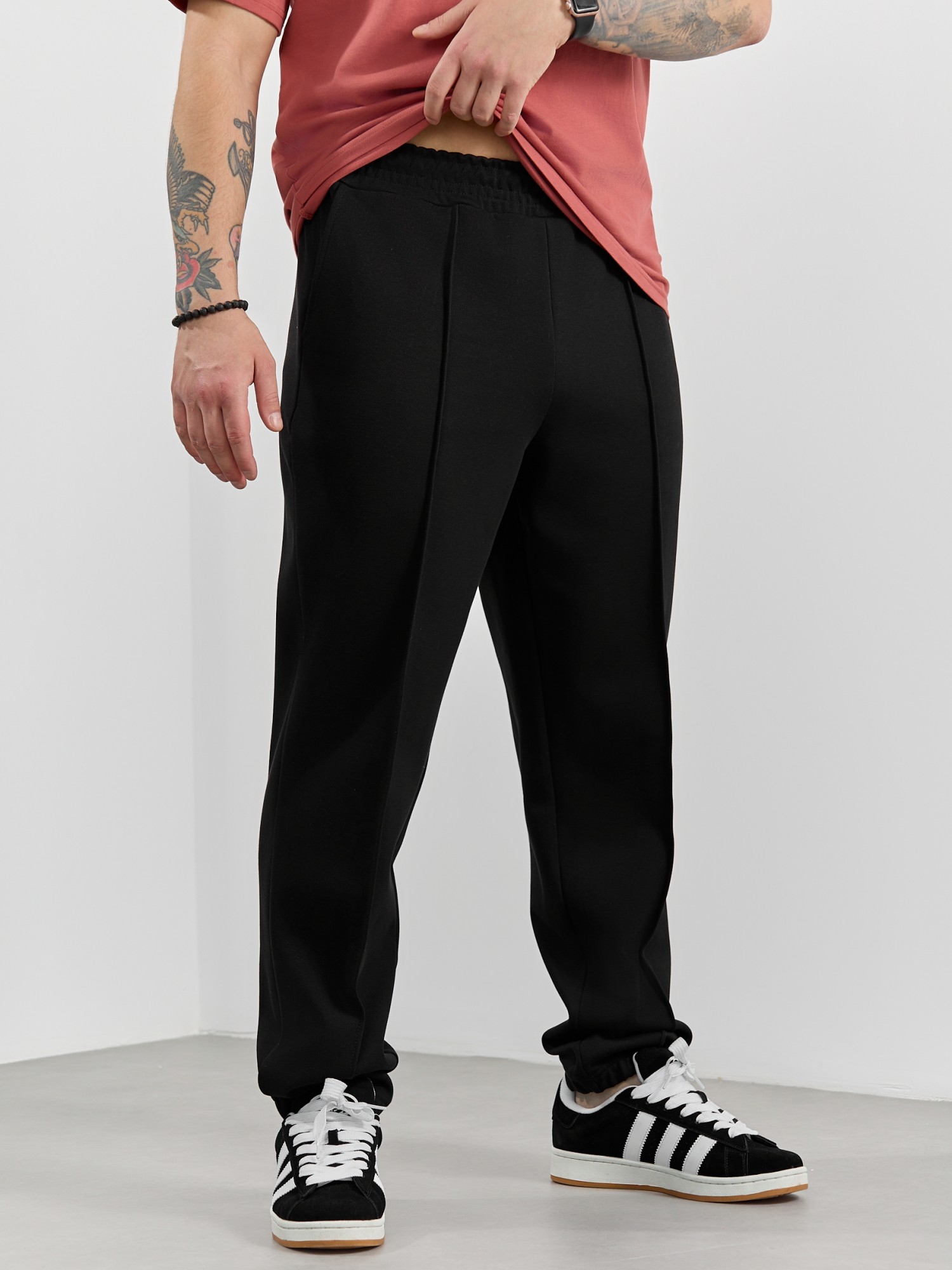 Брюки мужские из трикотажного полотна "интерлок-пике", на притачном поясе с эластичной тесьмой внутри, с карманами в боковых швах. По центру передних половинок расположены стрелки, закрепленные отделочной строчкой. Нижние срезы обработаны подгибкой с эластичной тесьмой. Для регулирования степени прилегания изделия по линии талии предусмотрен декоративный шнурок, вставленный в пояс и продетый через две обметанные петли в центре.