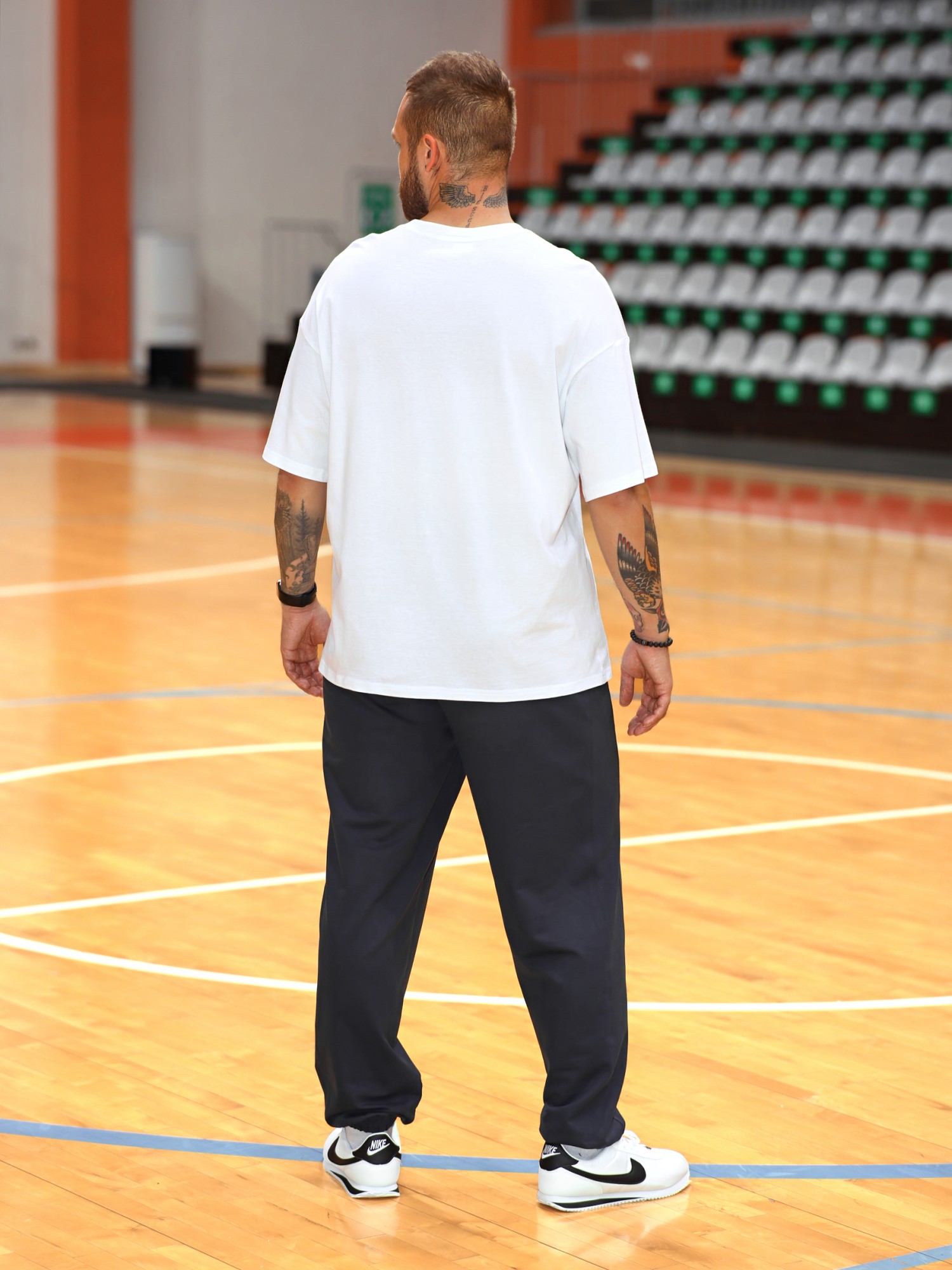 Брюки мужские из трикотажного полотна ""футер-двунитка"" на притачном поясе с эластичной тесьмой внутри, декоративными вставками в боковых швах и карманами, обработанными в соединительных швах передних половин с декоративными вставками. Нижние срезы брюк обработаны с эластичной тесьмой. По швам втачивания вставок и входам в карманы настрочены отделочные строчки. Через петлю пояса продет шнурок, позволяющий регулировать степень прилегания изделия по талии.