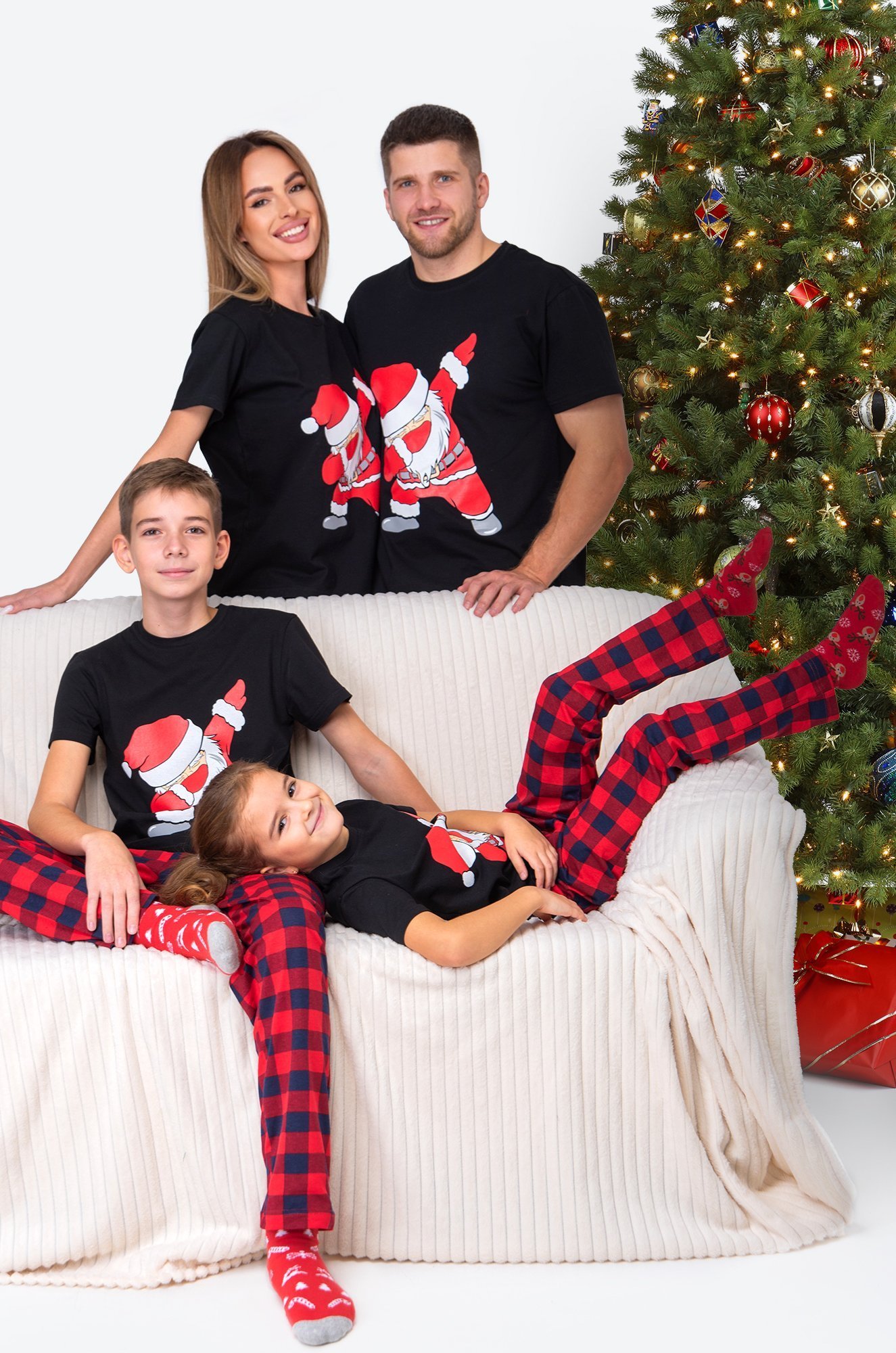 В комплекте черная футболка с коротким рукавом и красные штаны в шотландскую клетку. Эластичная резинка в поясе мягко прилегает к телу. Благодаря прямому крою костюм двойка с рождественским рисунком дарит свободу движений и уют во время сна.