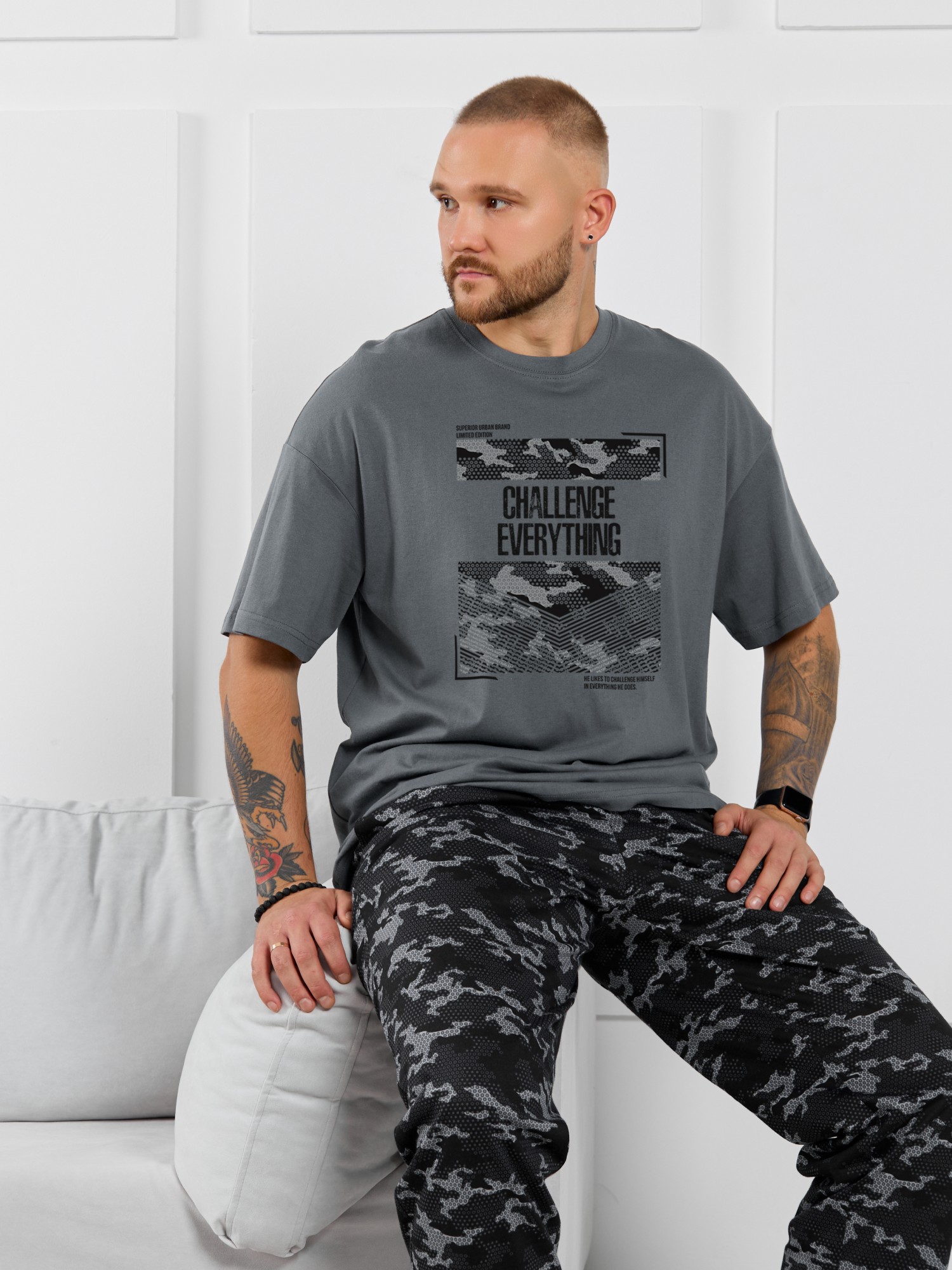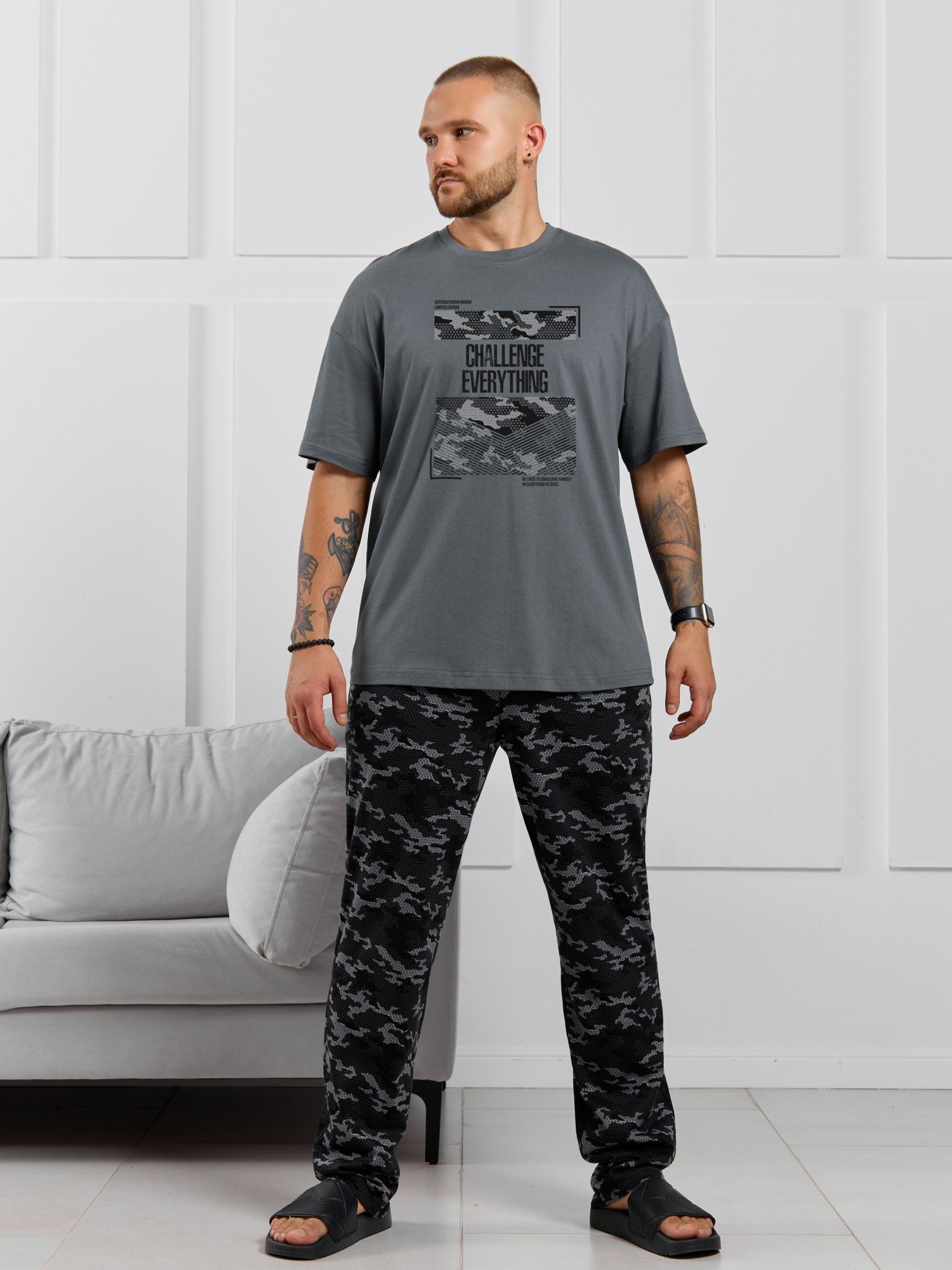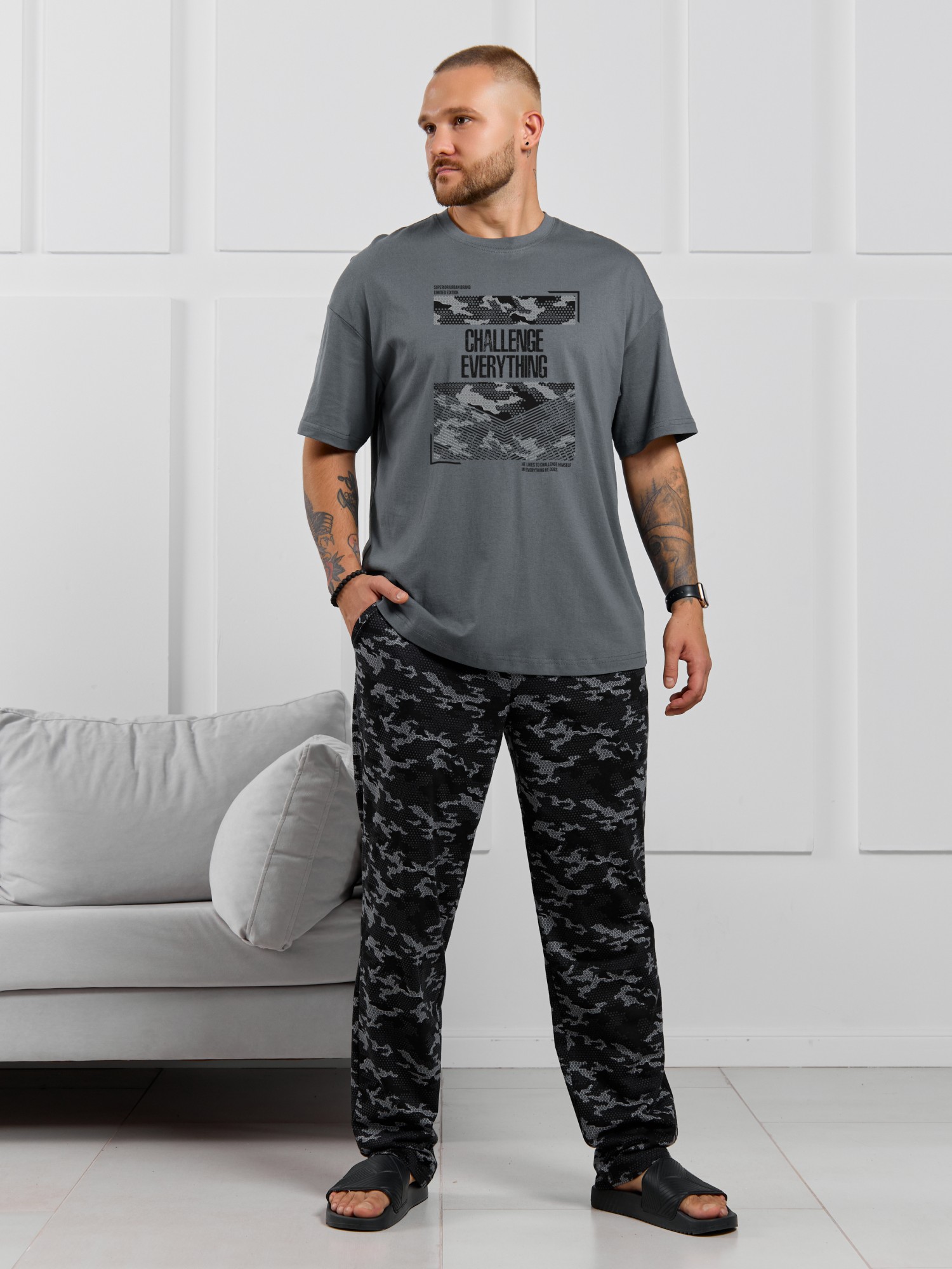 Костюм мужской, состоящий из футболки и брюк. Футболка однотонная с принтом на груди; модель свободная, со спущенной линией плеч, овальным вырезом горловины. Брюки из полотна с набивным рисунком эксклюзивного дизайна, прямые, с боковыми карманами с обтачными входами, на притачном поясе с отстроченной эластичной тесьмой.