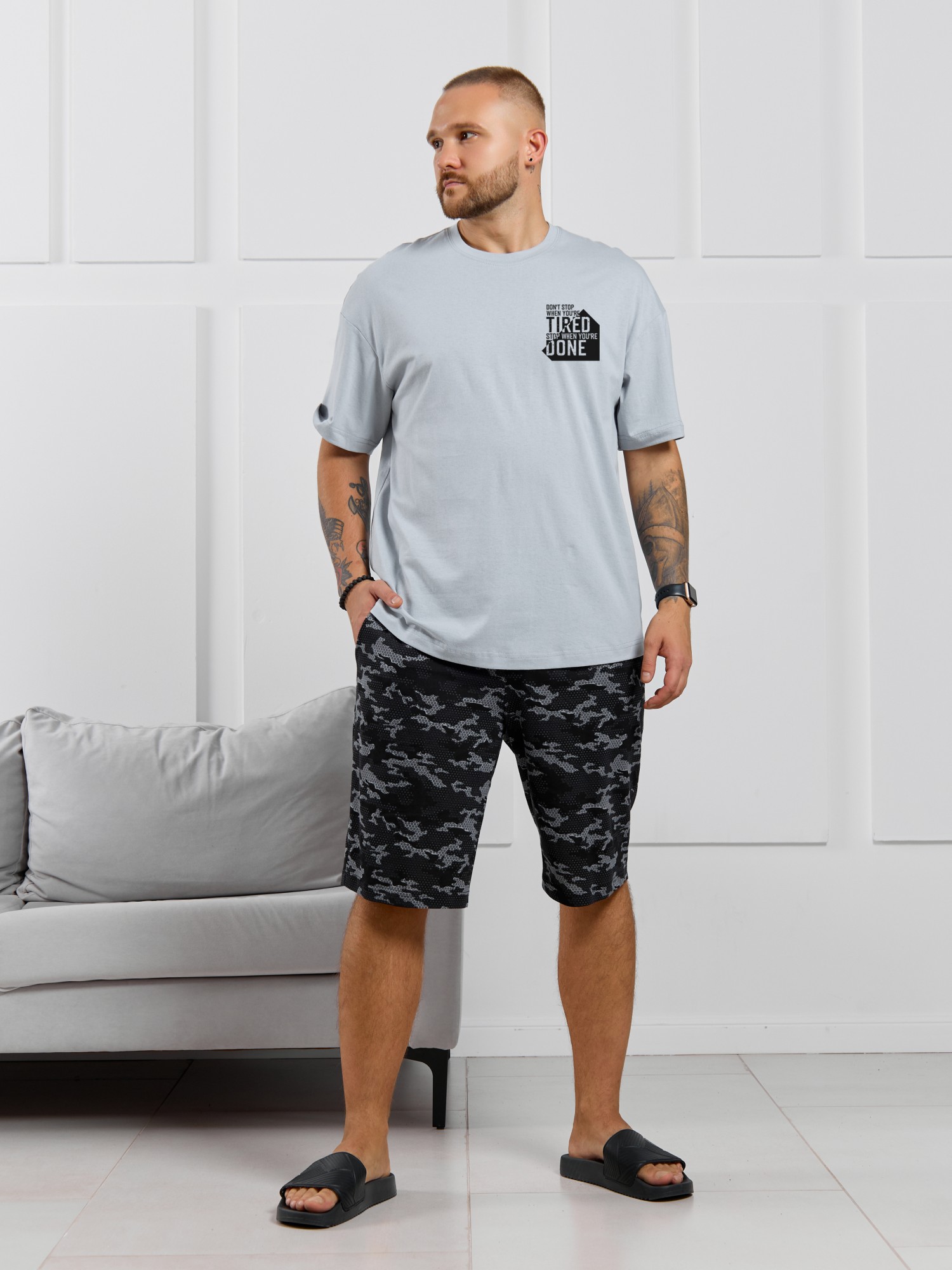 Костюм мужской, состоящий из футболки и шорт. Футболка однотонная с принтом на груди; модель свободная, со спущенной линией плеч. Шорты из полотна с набивным рисунком эксклюзивного дизайна, с боковыми карманами с обтачными входами, на притачном поясе с отстроченной эластичной тесьмой.