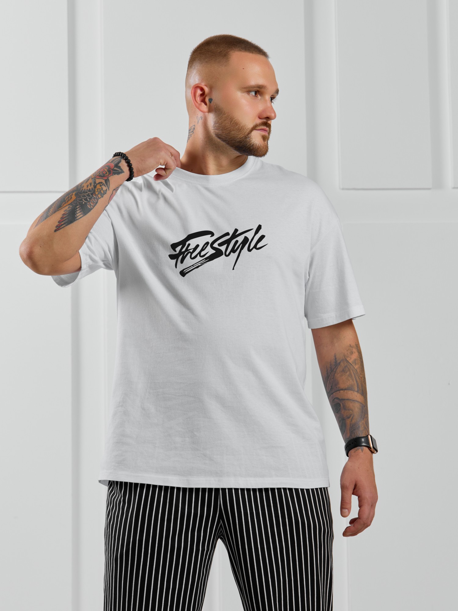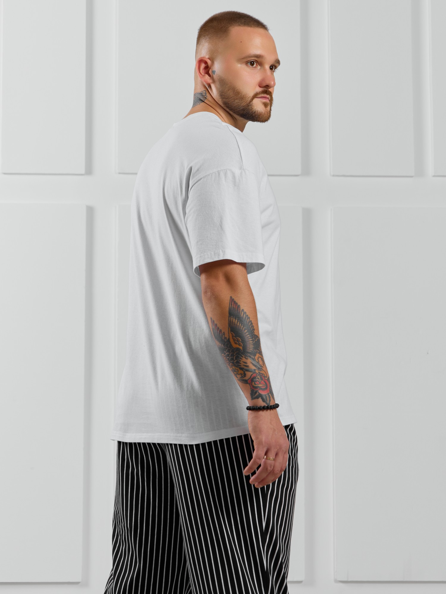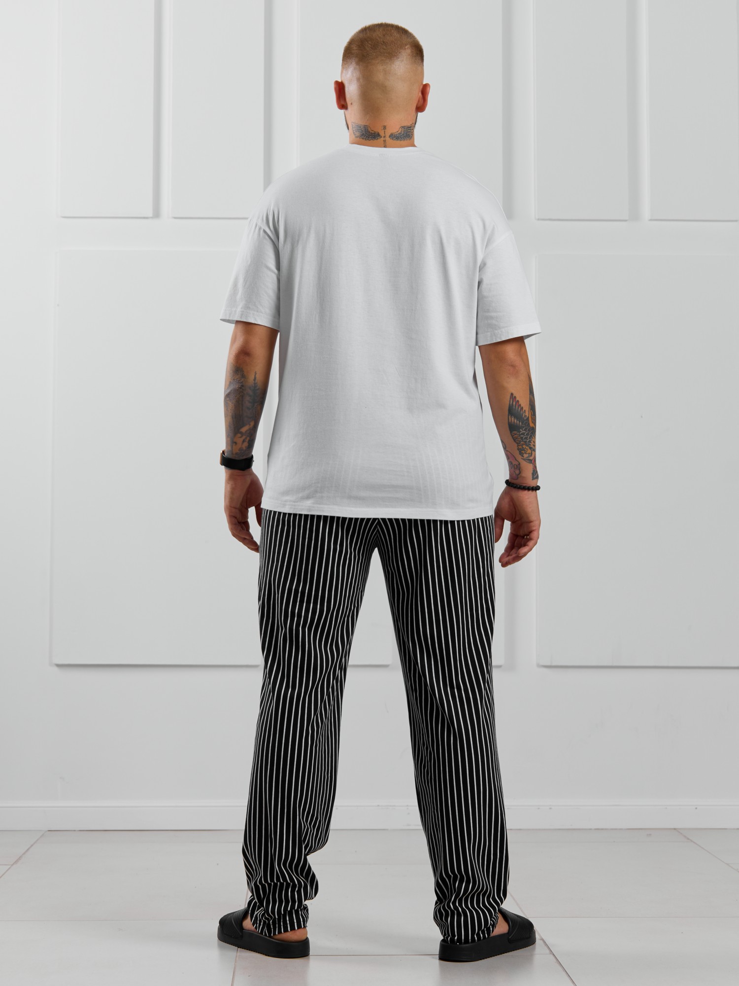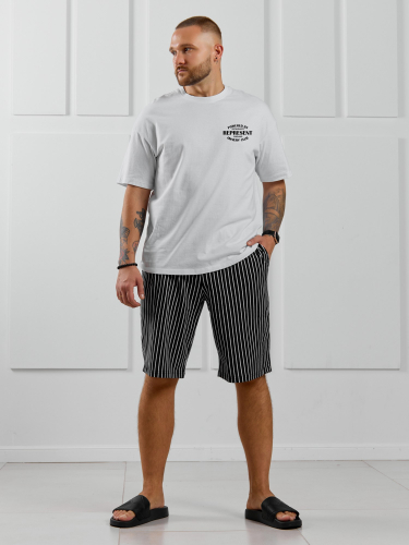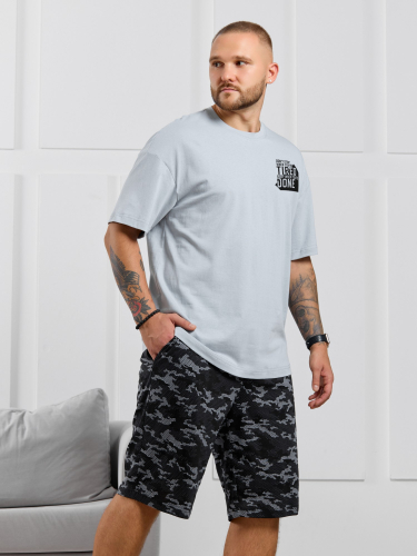 Костюм мужской, состоящий из футболки и брюк. Футболка однотонная с принтом на груди; модель свободная, со спущенной линией плеч. Брюки из полотна с набивным рисунком в узкую черно-белую полоску, прямые, с боковыми карманами с обтачными входами, на притачном поясе с отстроченной эластичной тесьмой.