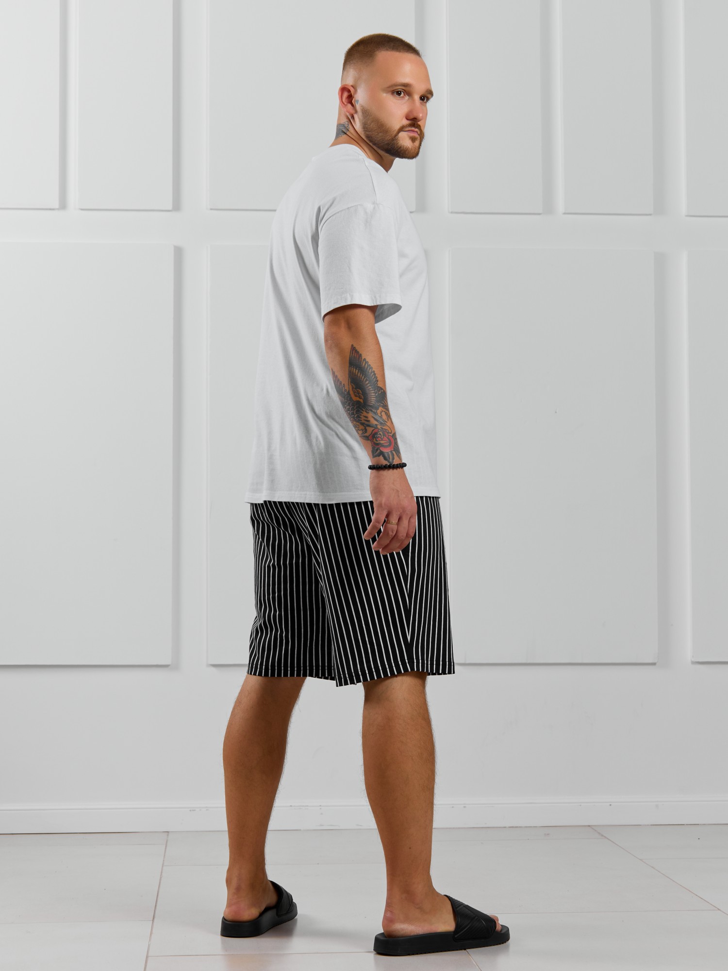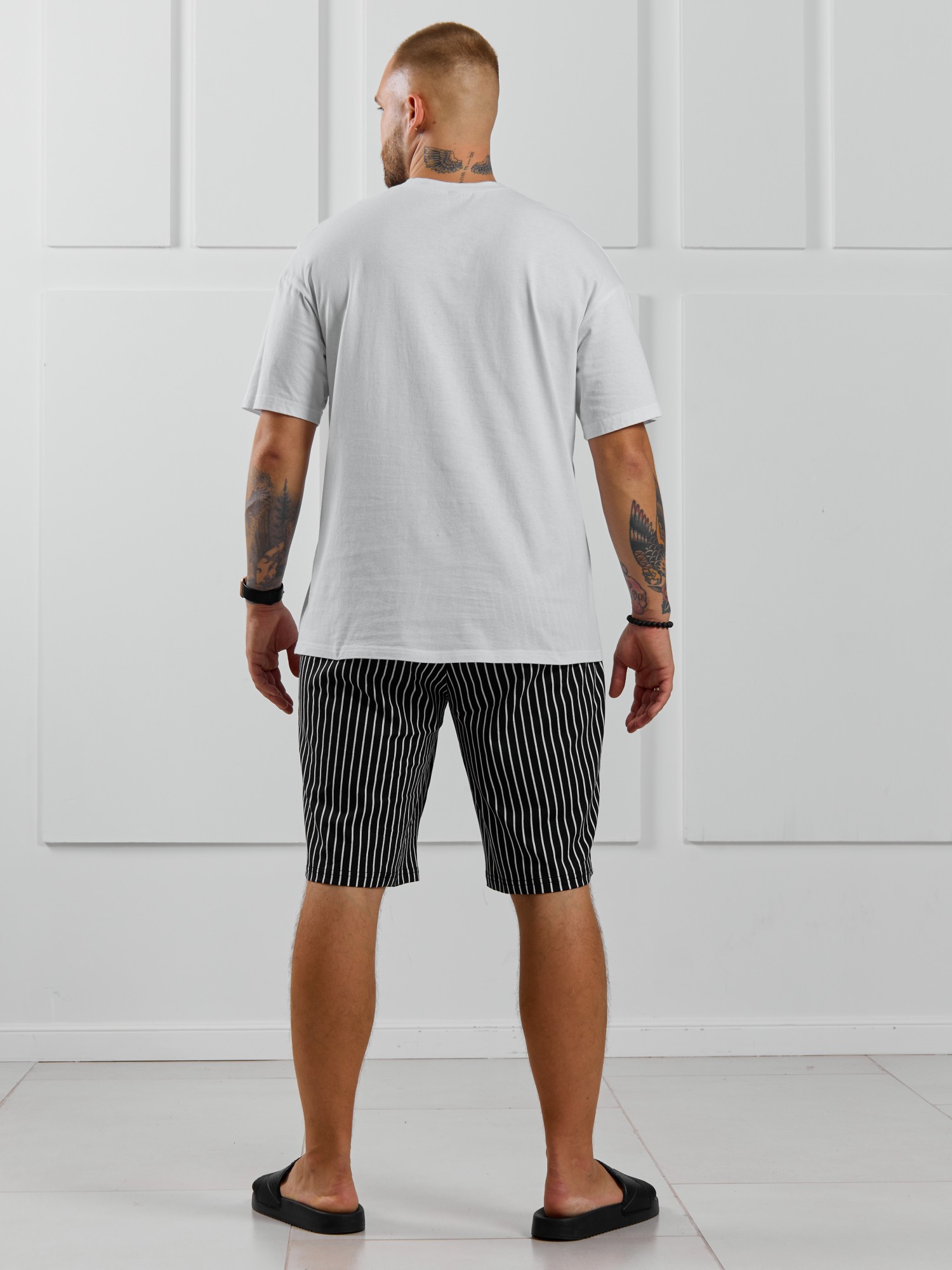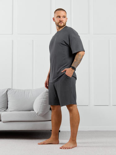 Костюм мужской, состоящий из футболки и шорт. Футболка однотонная с принтом на груди; модель свободная, со спущенной линией плеч. Шорты из полотна с набивным рисунком в узкую черно-белую полоску, с боковыми карманами с обтачными входами, на притачном поясе с отстроченной эластичной тесьмой.