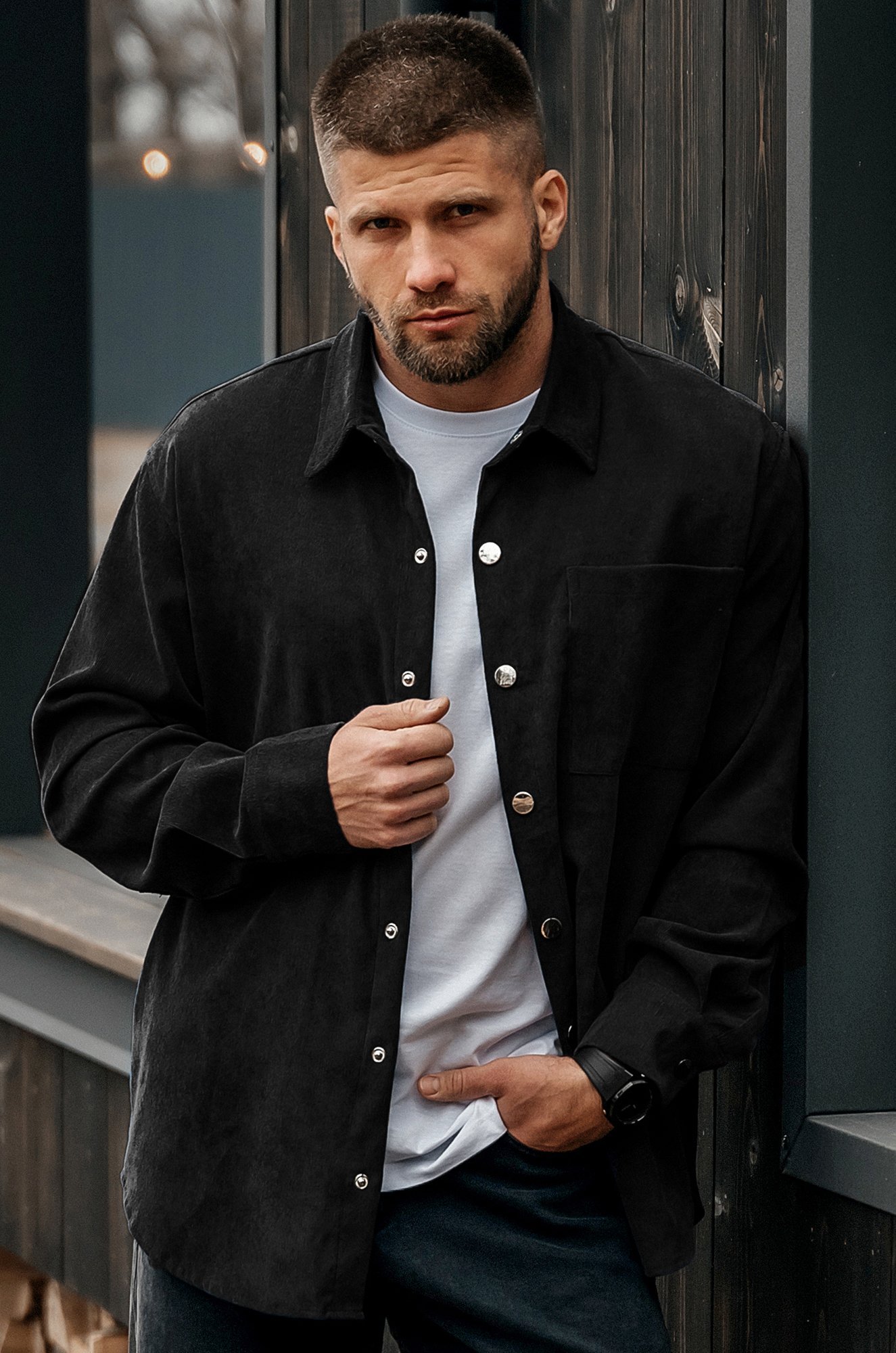 Мужская черная рубашка из мягкого вель..показатьвета – отличный способ подчеркнуть свою индивидуальность. Свободный крой подарит уют и комфорт, а карман на груди и застежка на металлические кнопки добавят стильную изюминку в образ. Однотонная вельветовая рубашка с удлиненной спинкой идеальна для прохладной весны и зябкой осени.