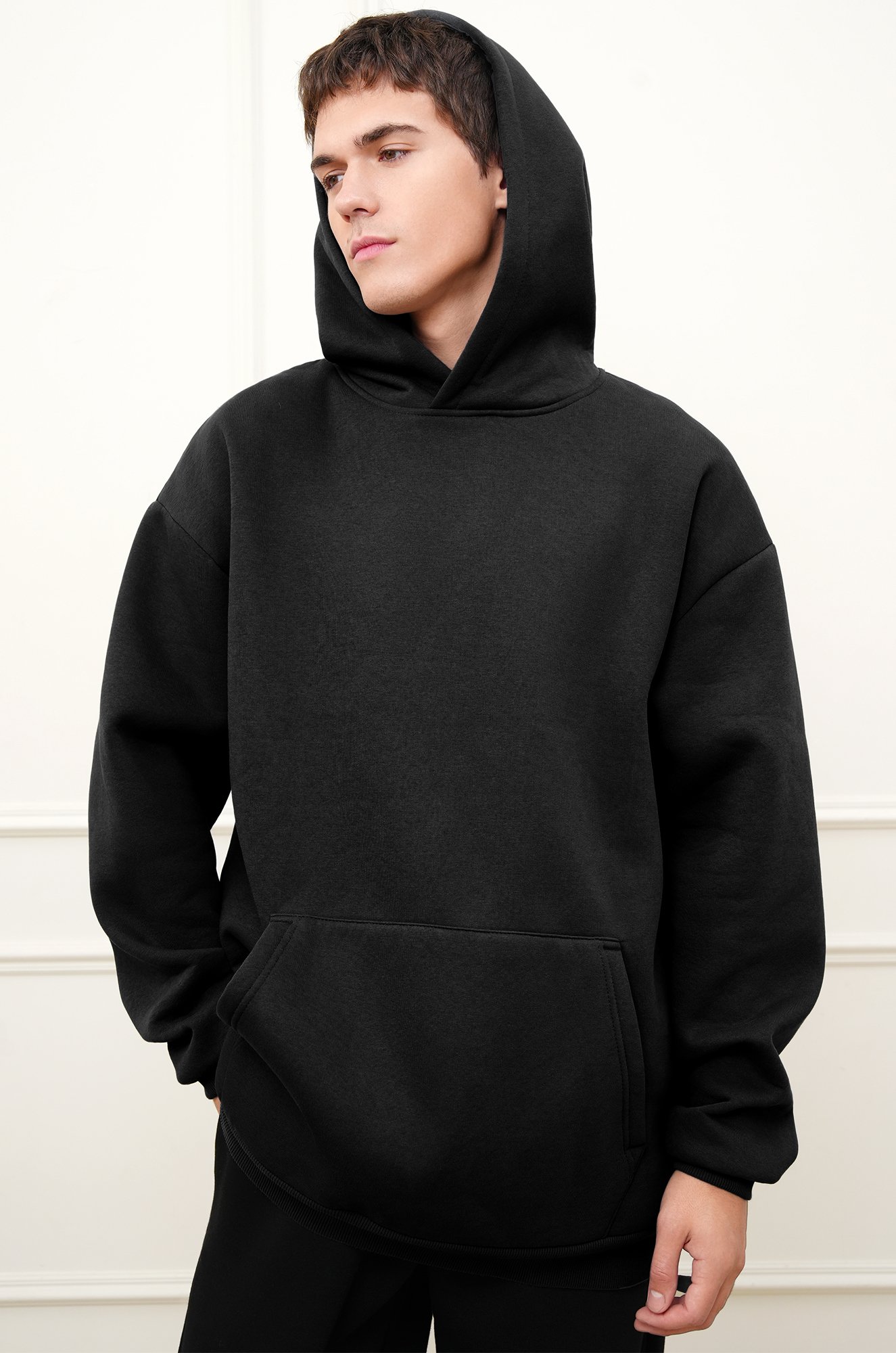 — черное худи выполнено из трикотажной ткани футер с начёсом;