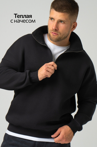 Черный мужской джемпер станет незаменимой частью вашего гардероба на осень и весну. Демисезонный свитер создан для мужчин, которые ценят качество и универсальность. Прямой крой, ворот стойка с застежкой на молнию добавляют классический штрих, делая его подходящим как для повседневных, так и для более официальных образов.