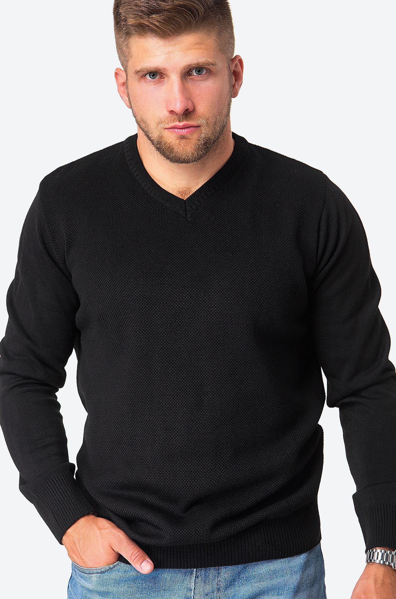 Стиль в простоте! Базовый мужской джем..показатьпер выполнен из вязаного трикотажа. Мягкая шерстяная пряжа с добавлением акрила не колется и приятна к телу, акцентный V-вырез добавляет образу брутальности, а фактурная вязка выгодно выделяет черный джемпер для мужчин среди других моделей. Теплый однотонный свитер – нестареющая классика для прохладной осени и весны.