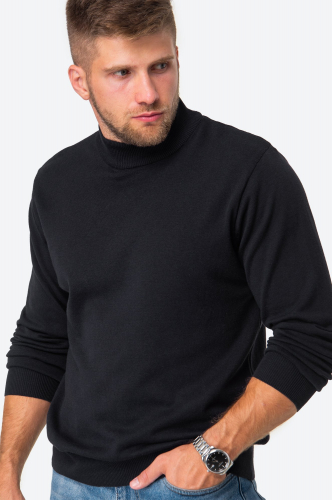 Черный джемпер с воротником-стойкой для мужчин выполнен из вязаного трикотажа: в нём будет уютно и тепло в прохладную погоду. Водолазка из мягкой хлопковой пряжи с акрилом невероятно приятный к телу. Короткий воротник не пережимает горло и отлично держит форму.