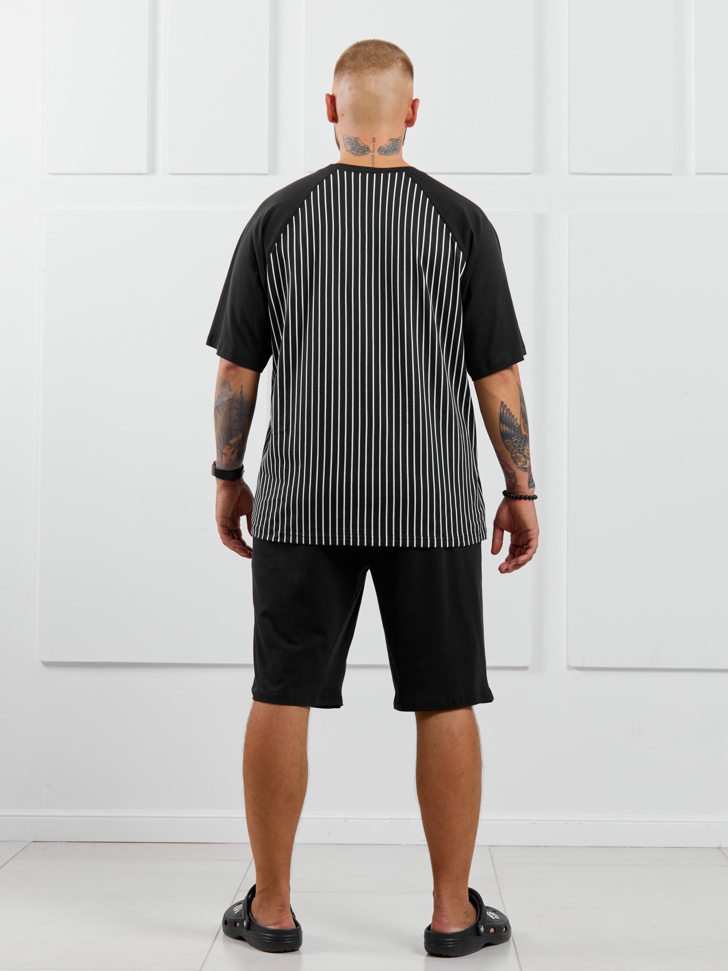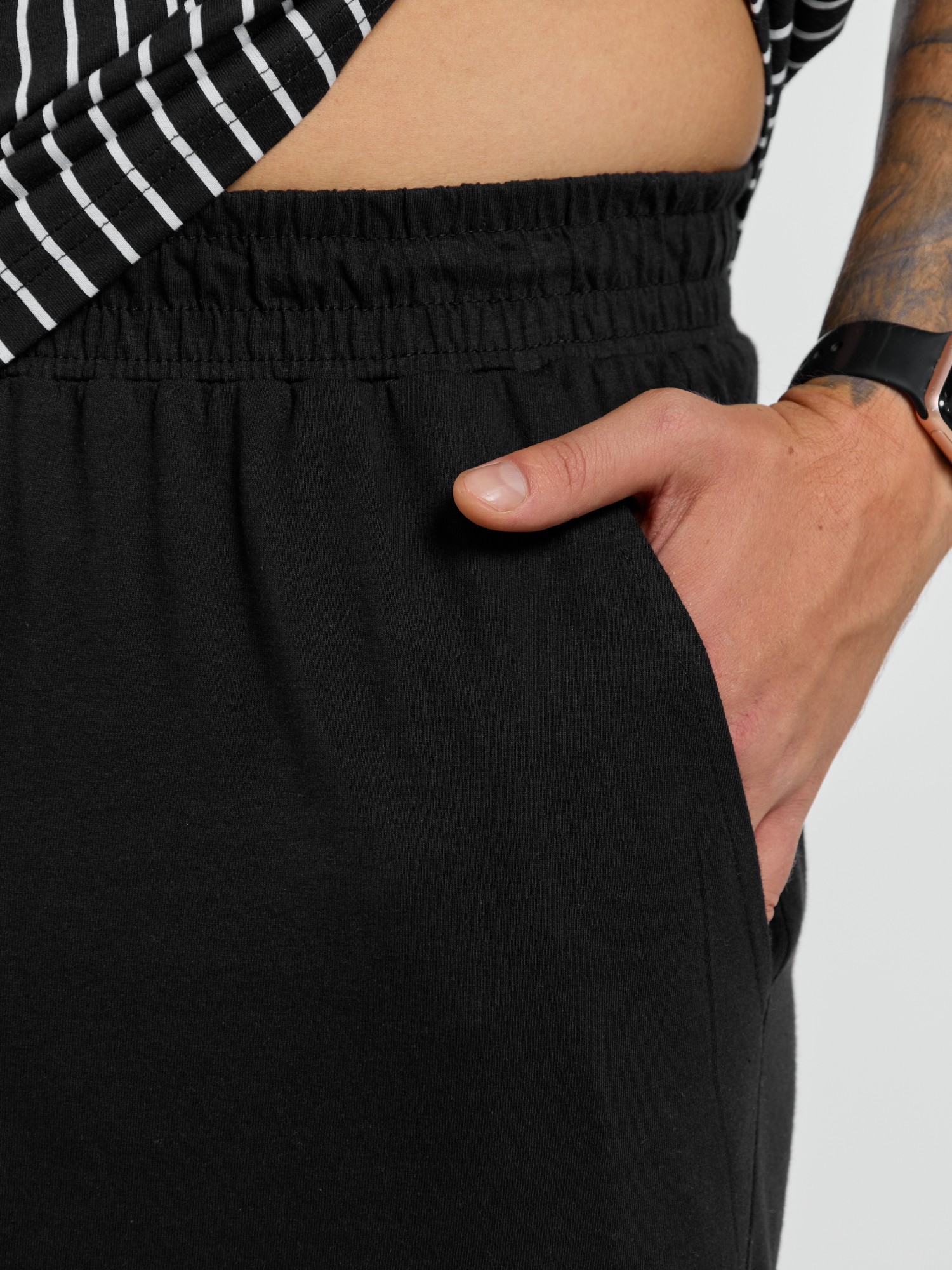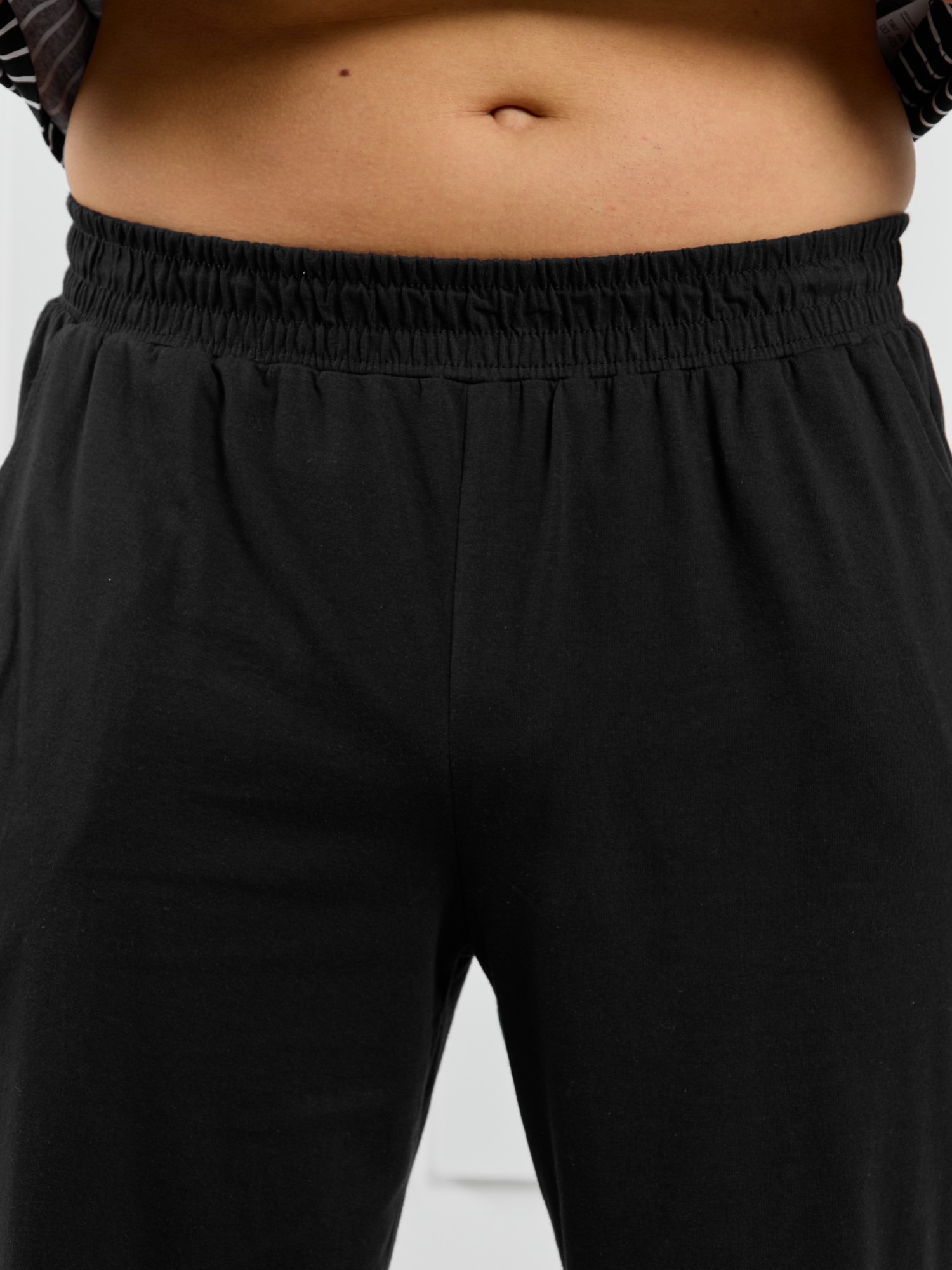 Базовые шорты из однотонного полотна кулирного переплетения черного цвета. Модель с боковыми карманами с обтачными входами, на притачном поясе с отстроченной эластичной тесьмой.
