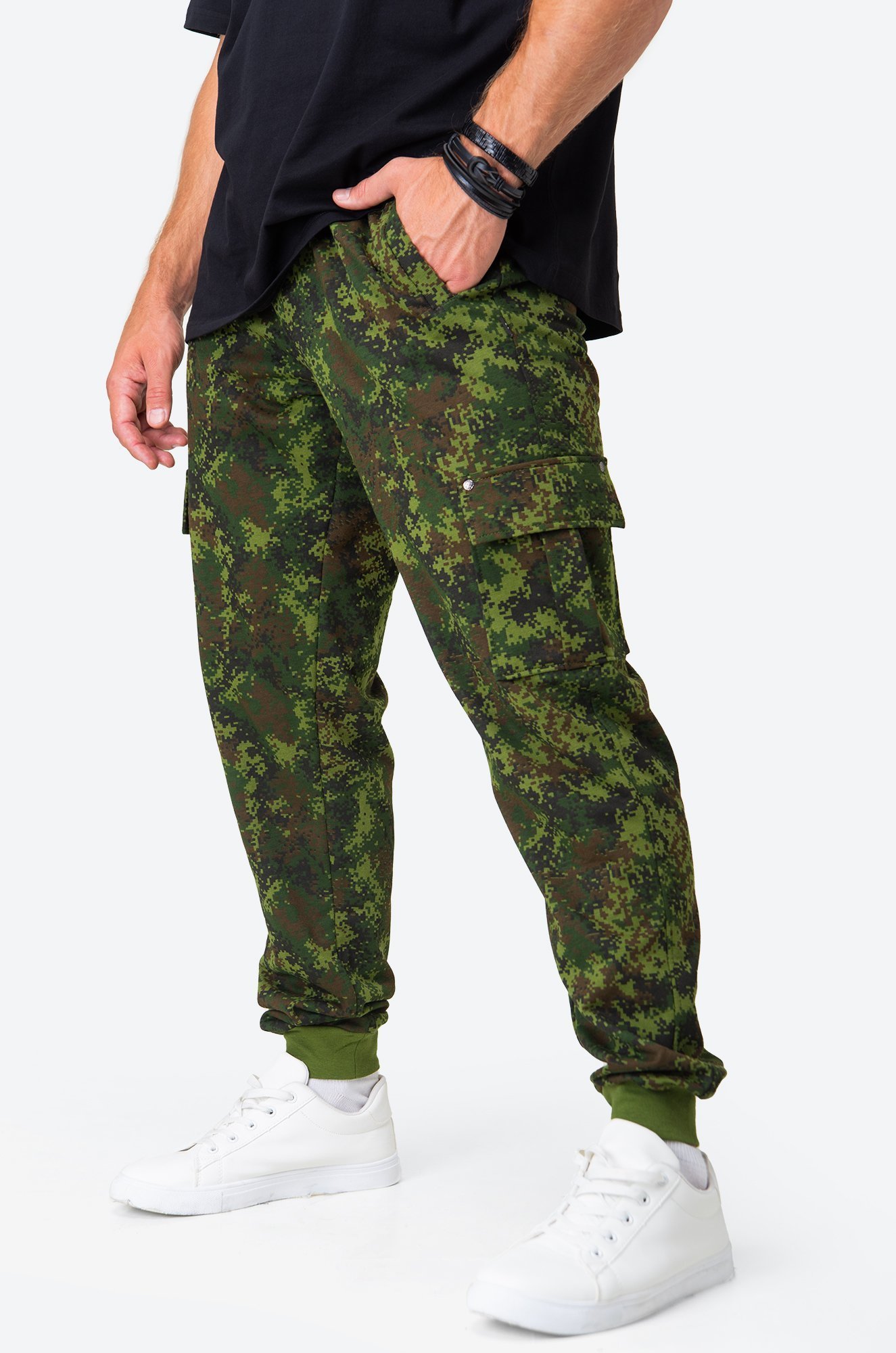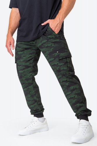 Мужские камуфляжные брюки – отличное р..показатьешение для любителей охоты, рыбалки и туризма. Благодаря добавлению полиэстера в ткань брюки из футера двухнитки мягкие и прочные, что делает их идеальным выбором для активного отдыха, страйкбола и занятий спортом. Спортивные джоггеры выполнены в темно-зеленом цвете с рисунком в стиле милитари.