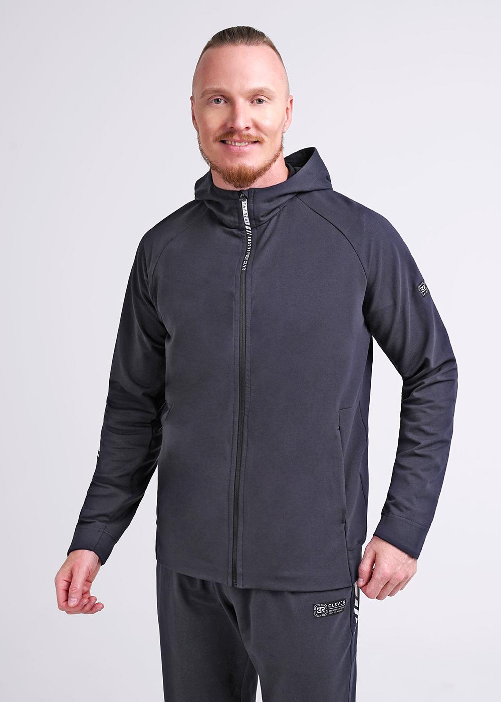 Мужская куртка из футера на молнии. Изделие дополнено 2-мя вместительными карманами на молнии, имиджевой фурнитурой и дизайнерским принтом. Комфортный и практичный вариант для активных мужчин.