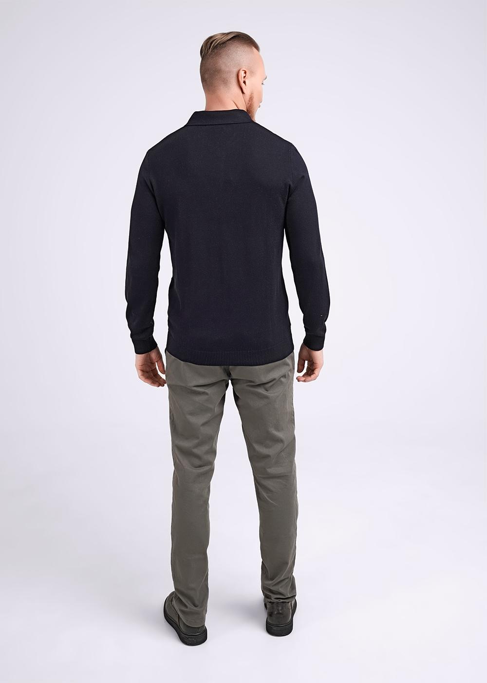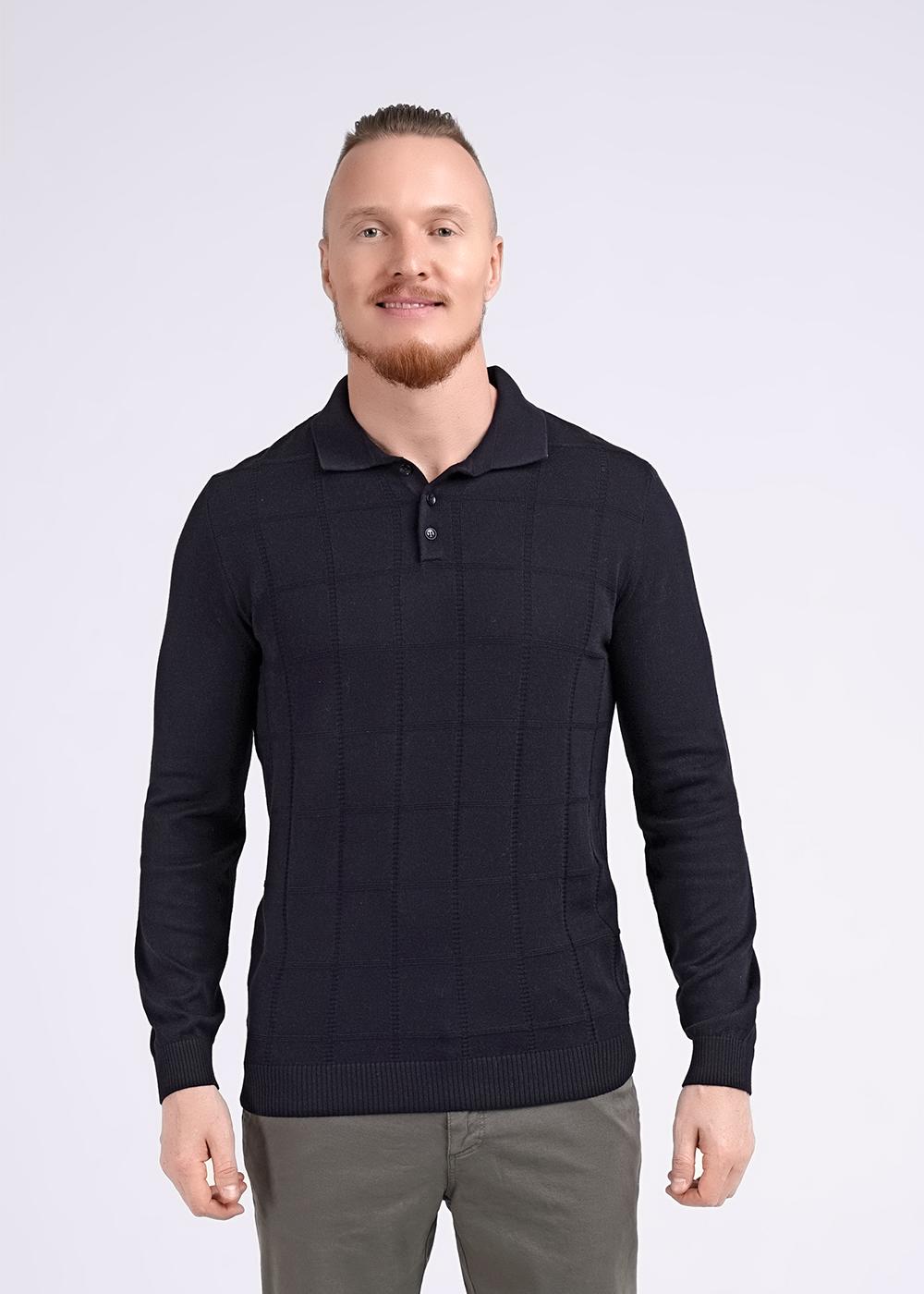 Мужское вязаное поло с длинным рукавом. Модель связана из приятной хлопковой пряжи с добавлением акрила в интересную фактурную клетку по передней стороне. Изделие можно сочетать как в классическом стиле, так и в повседневном.