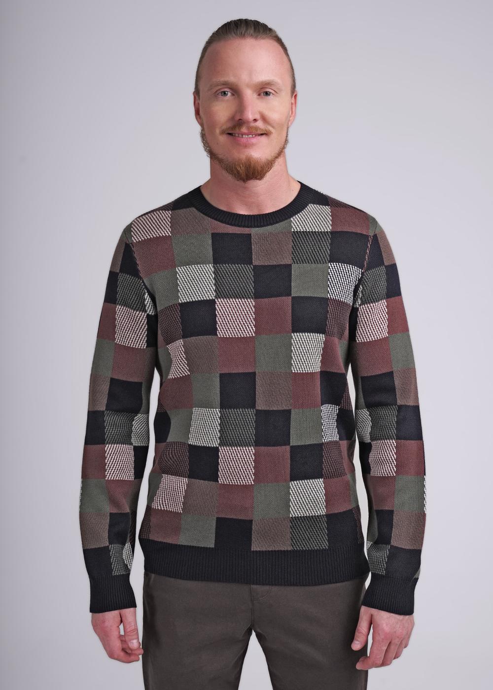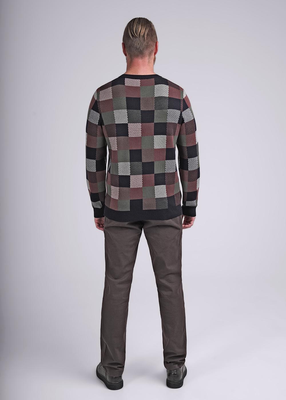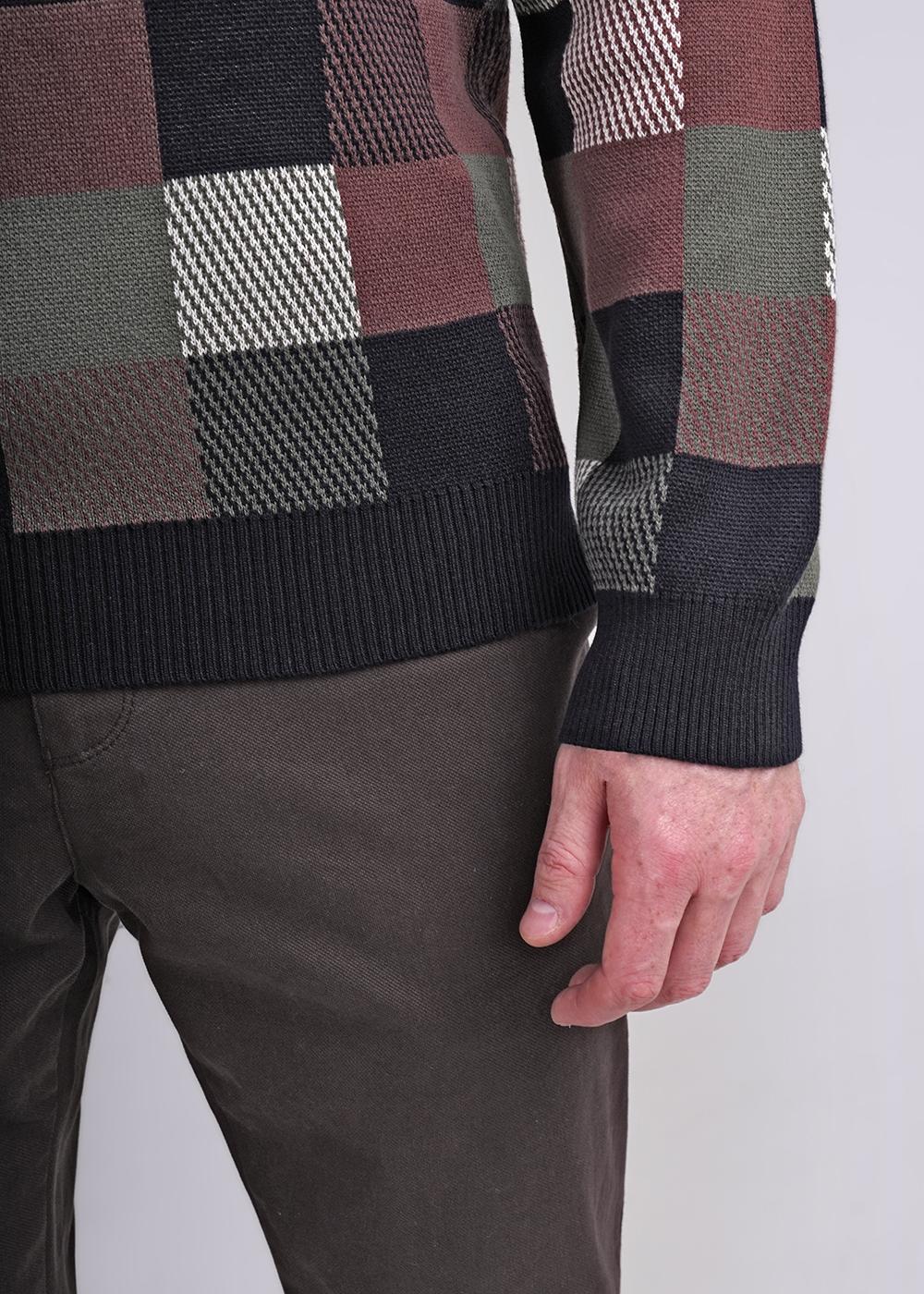 Мужской вязаный клетчатый джемпер свободного силуэта с круглым вырезом горловины и длинным рукавом. Джемпер выполнен из смесовой пряжи с хлопком. Изделие подойдет к любому низу и согреет в прохладную погоду.